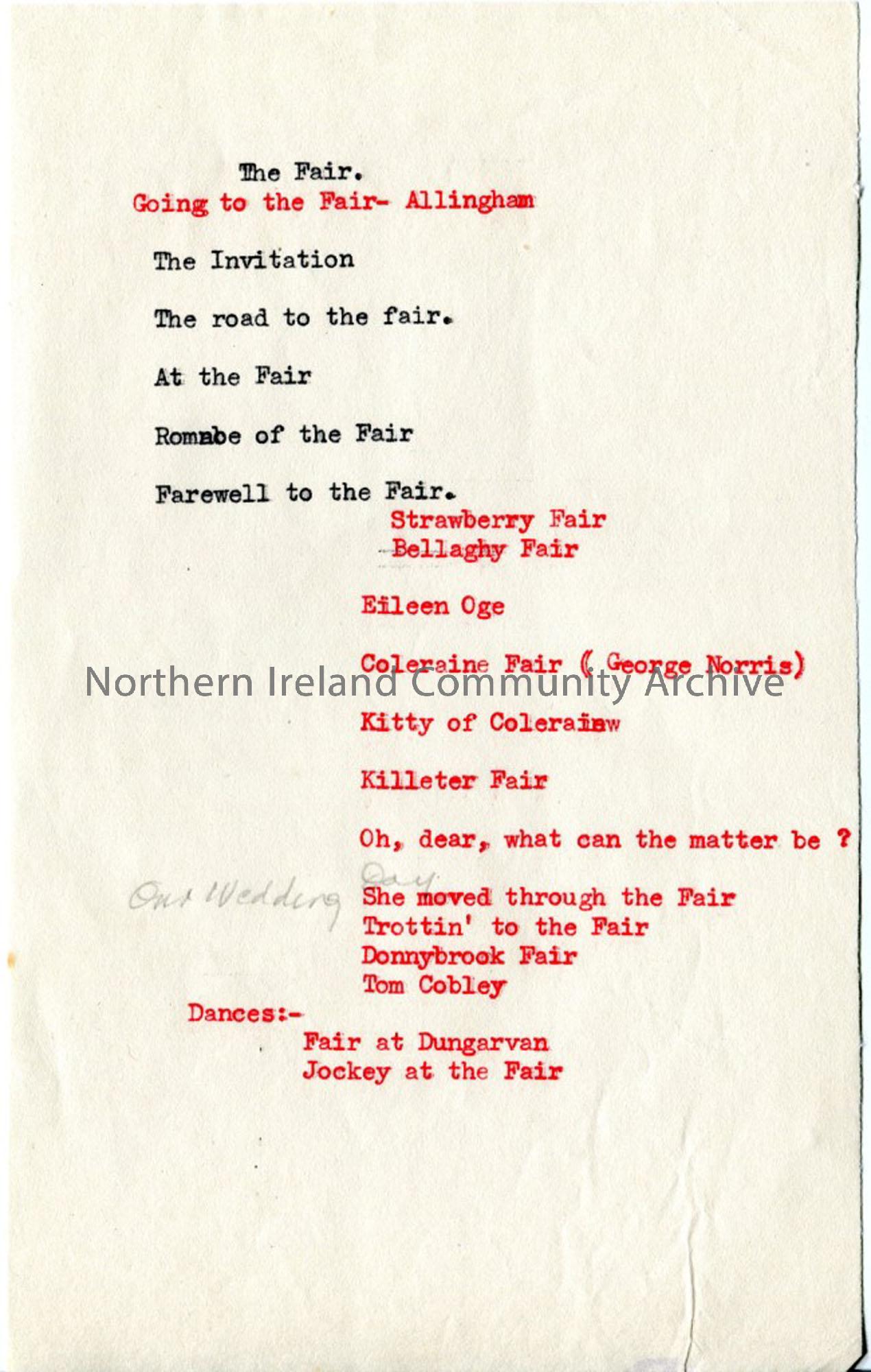 Typed brief notes under heading 'The Fair' - titles only to songs.