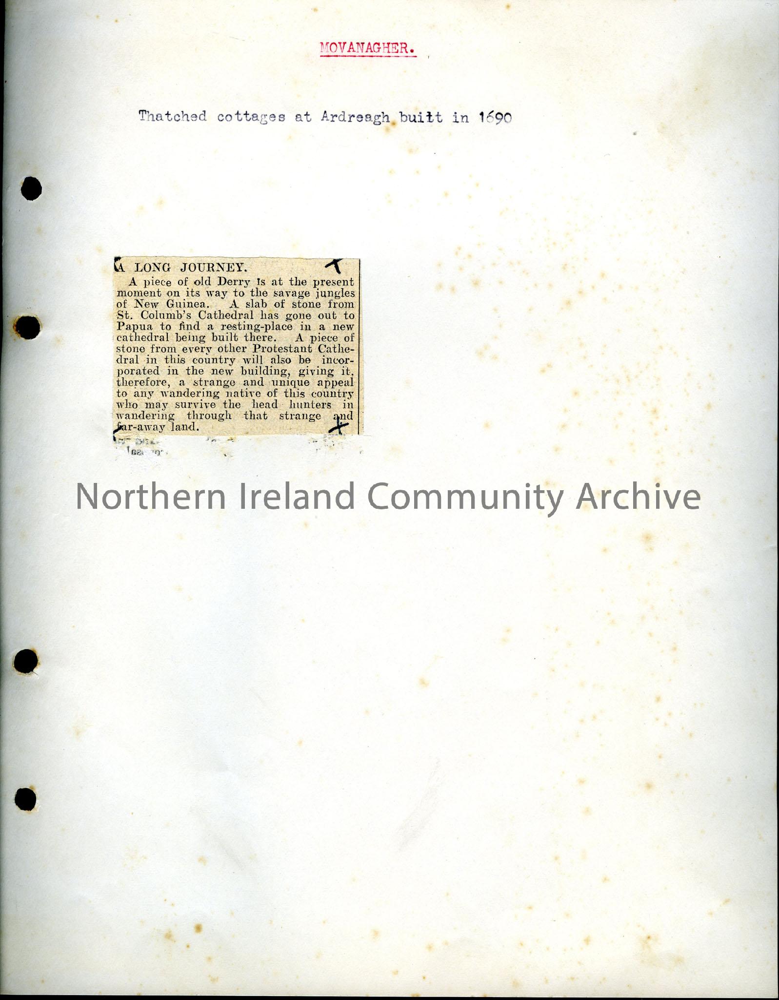 Notes titled 'Movanagher'. Clipping from a newspaper attached, titled 'A Long Journey'. Re: a a slab stone from St. Columb's Cathedral going out to Papua to form part of a new cathedral being built there.