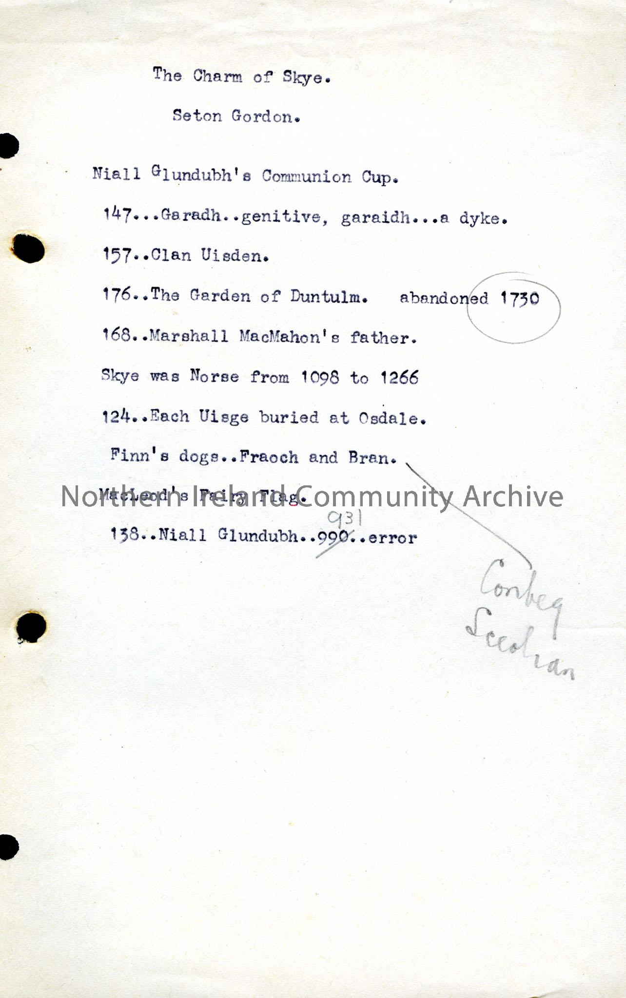 Notes with page numbers taken from "The Charm of Skye" by Seton Gordon. They refer to Niall Glundubh, Clan Uisden, the Garden of Duntulm and MacLeod's Fairy Flag among other things.