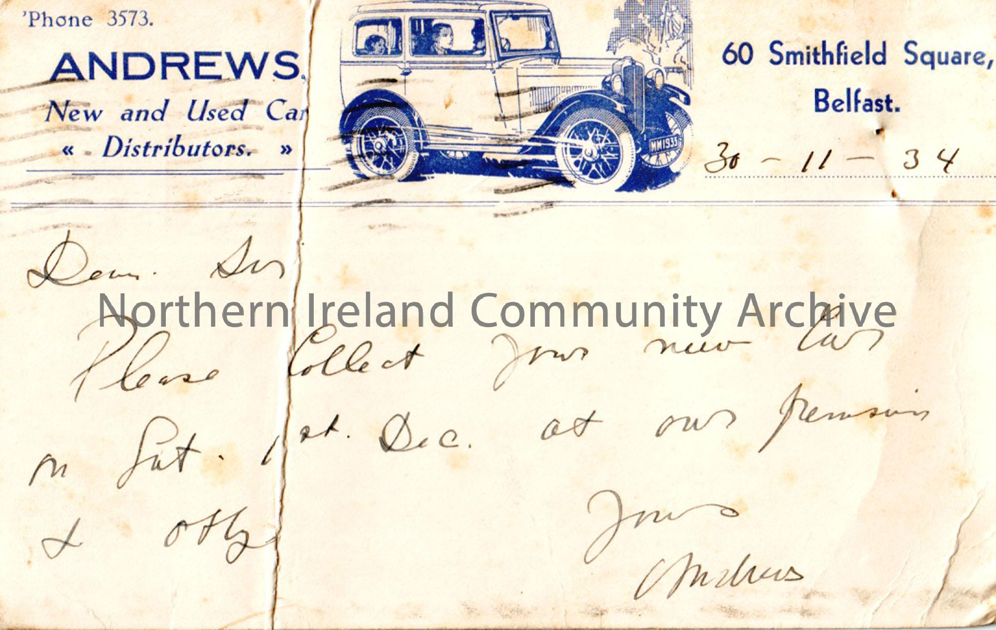 notice car posted to Donor’s father from Andrews’ Motor Garages inviting him to pick up his new car