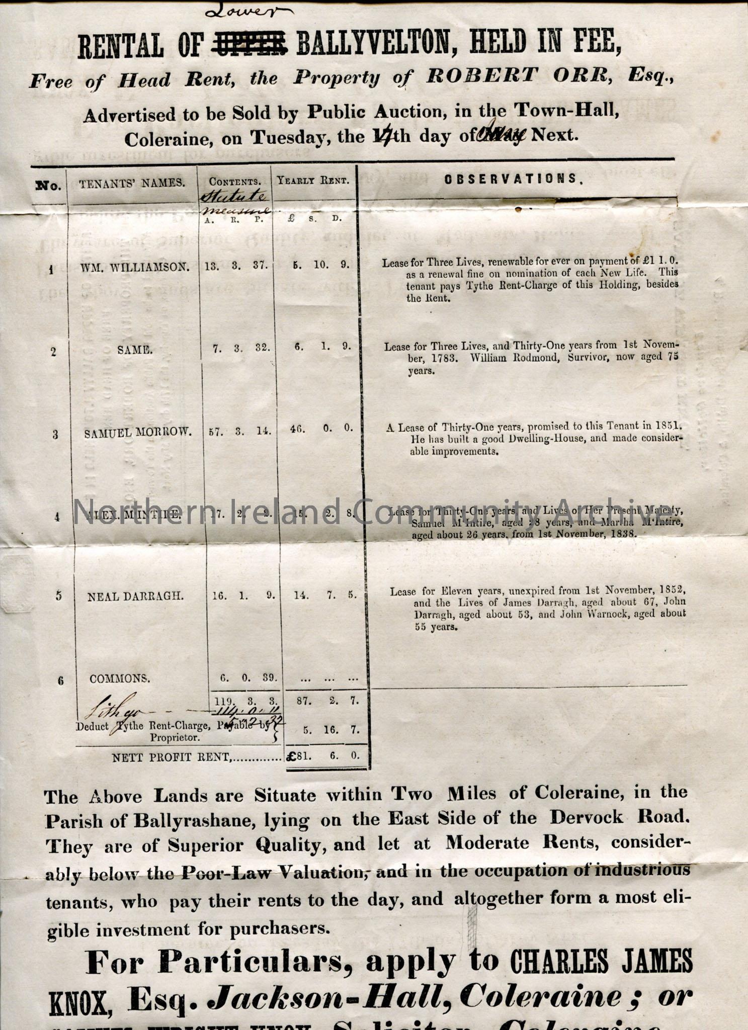 Notice for sale of Rental property by Public Auction – tenants names and description and location of lands and comments about improvements. Poster for…