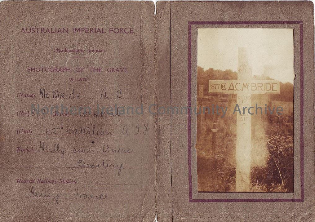 Notification of location of the war grave of A.C. McBride Corporal 42nd Battalion, Australian Imperial Force. Fading black and white photograph with grey/green card surround.