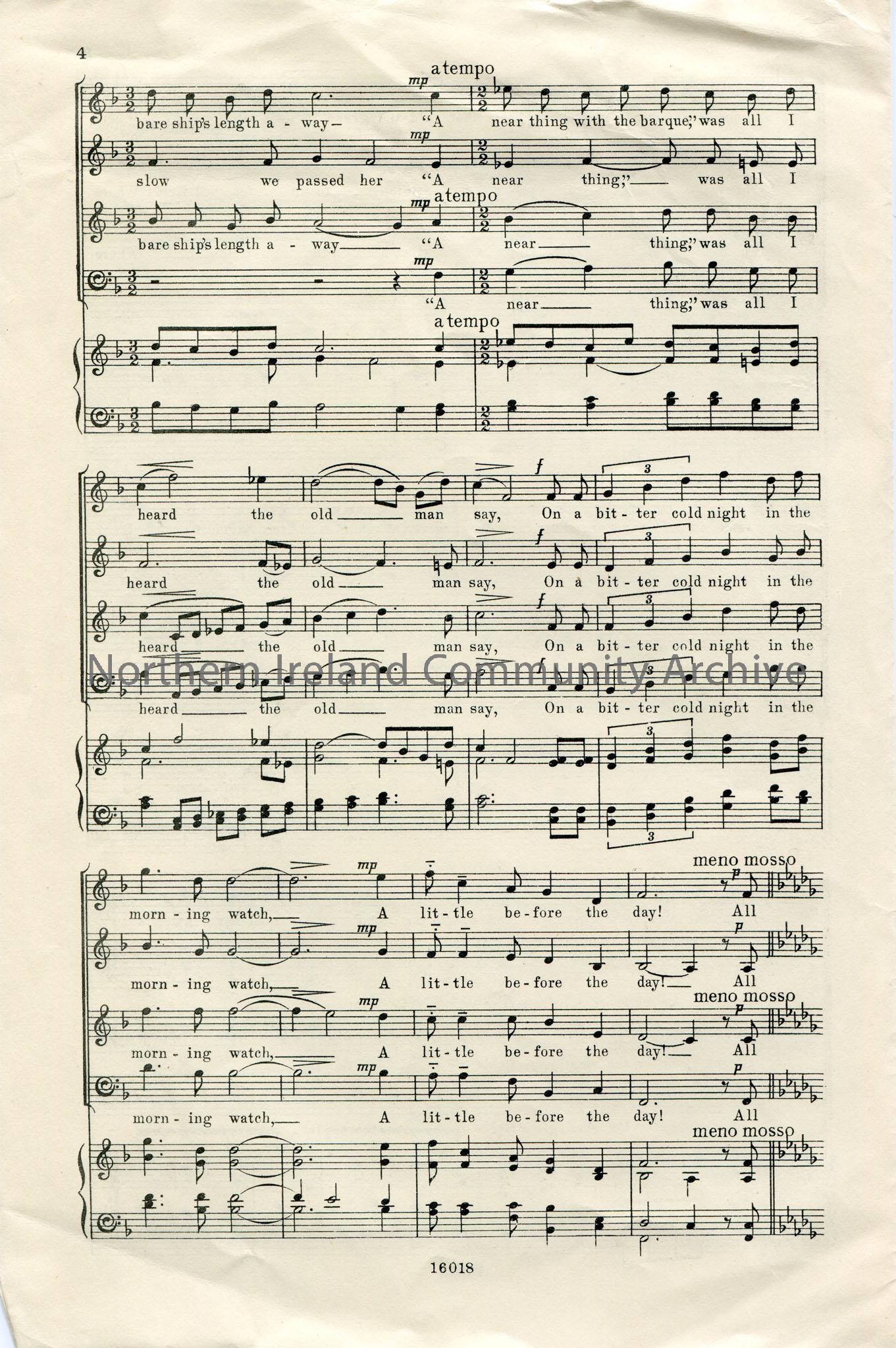 Novello's Part-Song Book. The Sailor's Garland, words by C. Fox Smith, music by Alec Rowley. No.7 Rathlin Head. Booklet of sheets of music. 2 separate pages, 8 sides in total.