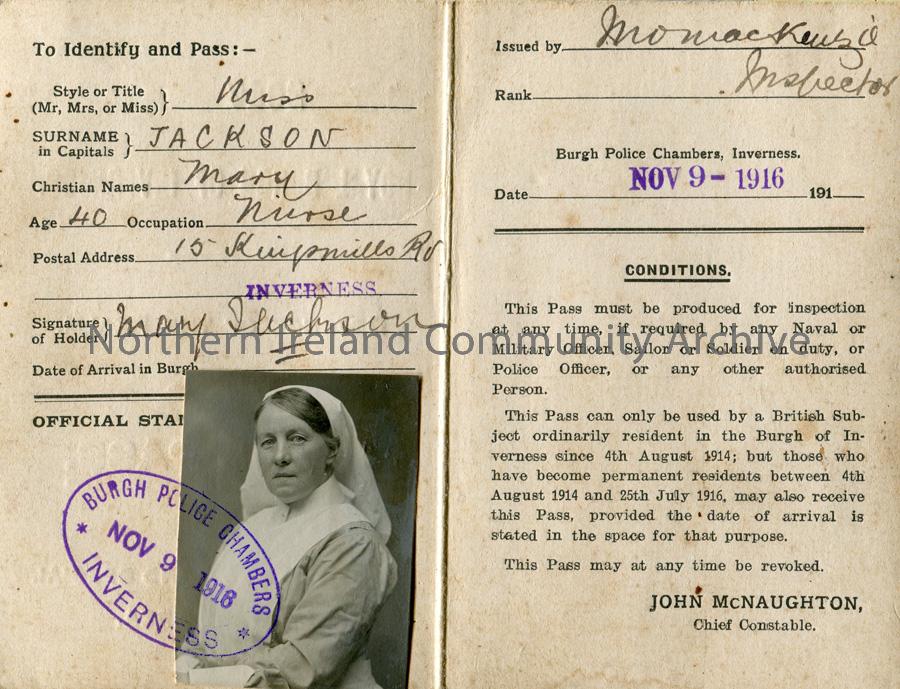 Nurse Mary Jackson Security Pass, 1916