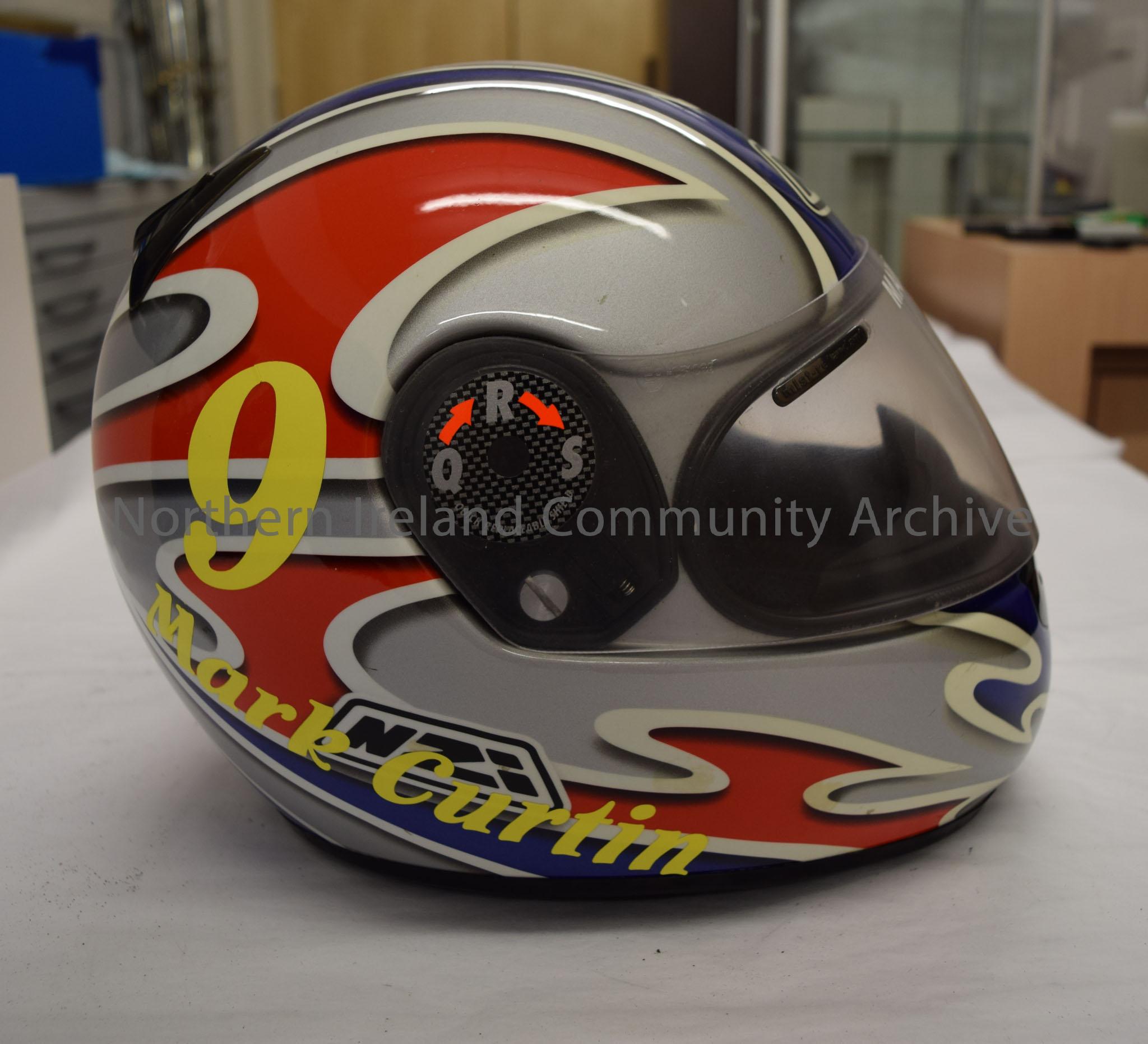 NZI motorcycle helmet belonging to Mark Curtin. Grey with blue pattern down the middle and a red and white pattern on the sides. Decorated with yellow lettering