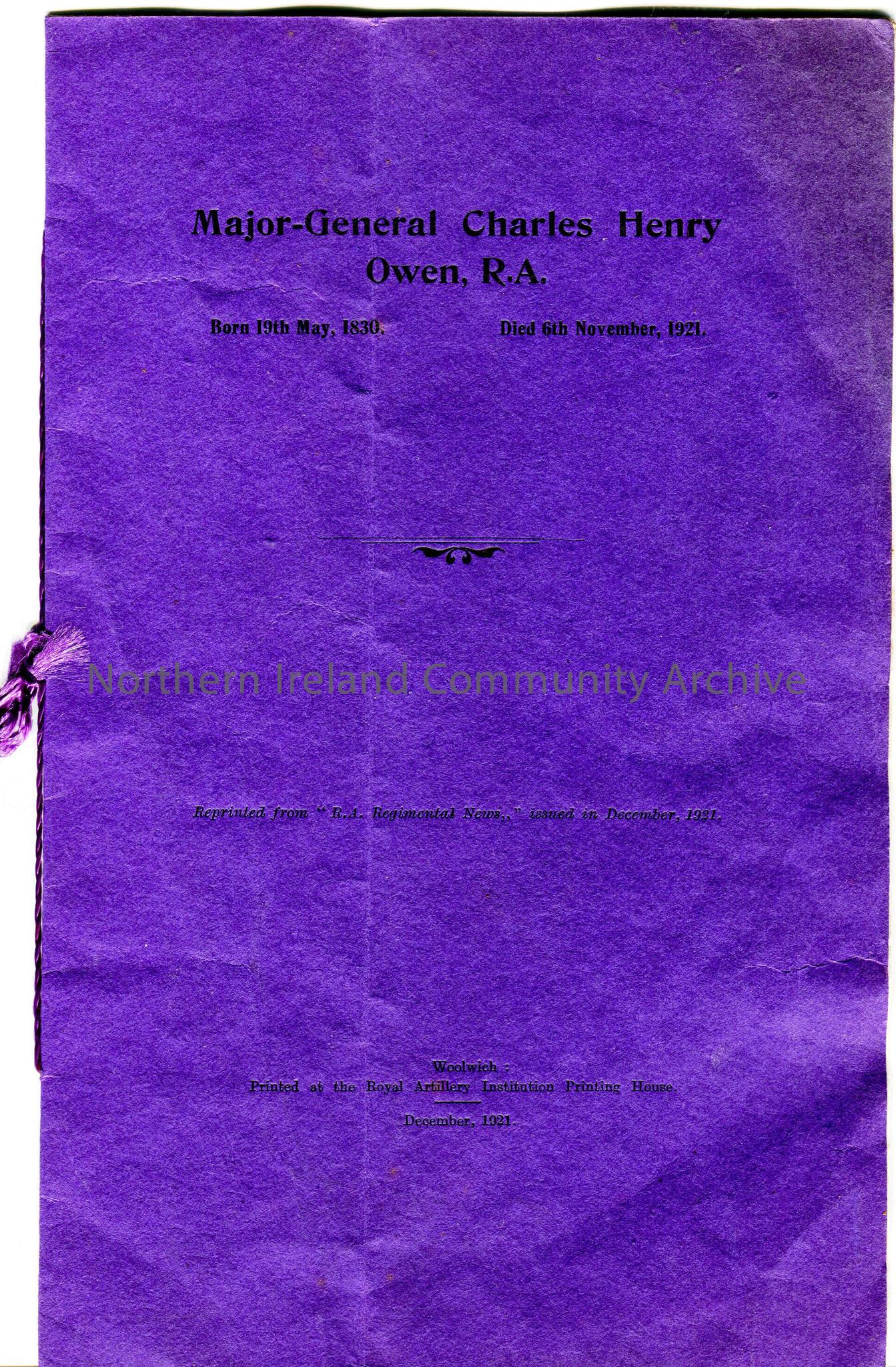 Obituary of Major-General Charles Henry Owen - maternal grandfather of R K Hezlet - detailing military achievements. Inside front cover small cutting affixed - list of wills and their worth, including Owen's - dated 2.2.22