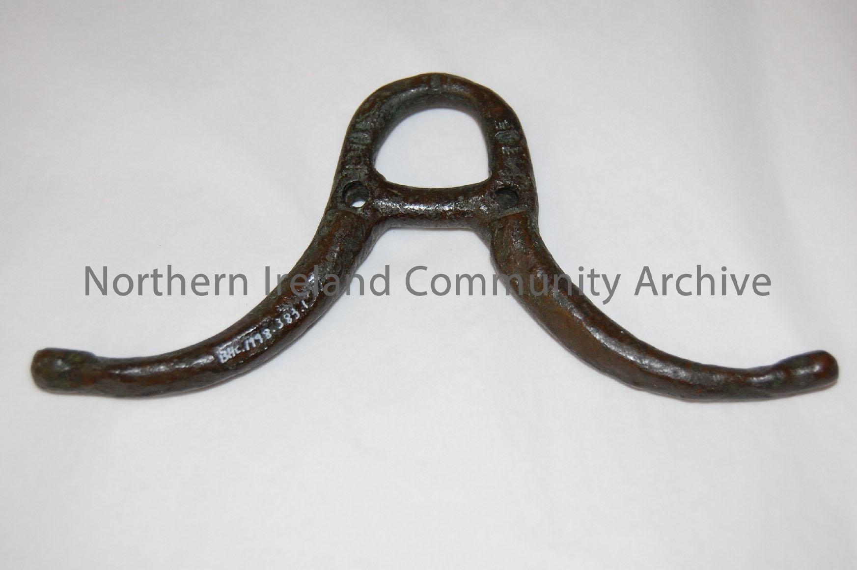 Objects shaped in an elongated ‘A’. A basic pattern of three indents on head of object, along with two holes which would probably be used for fastenin… – 1998.383.1