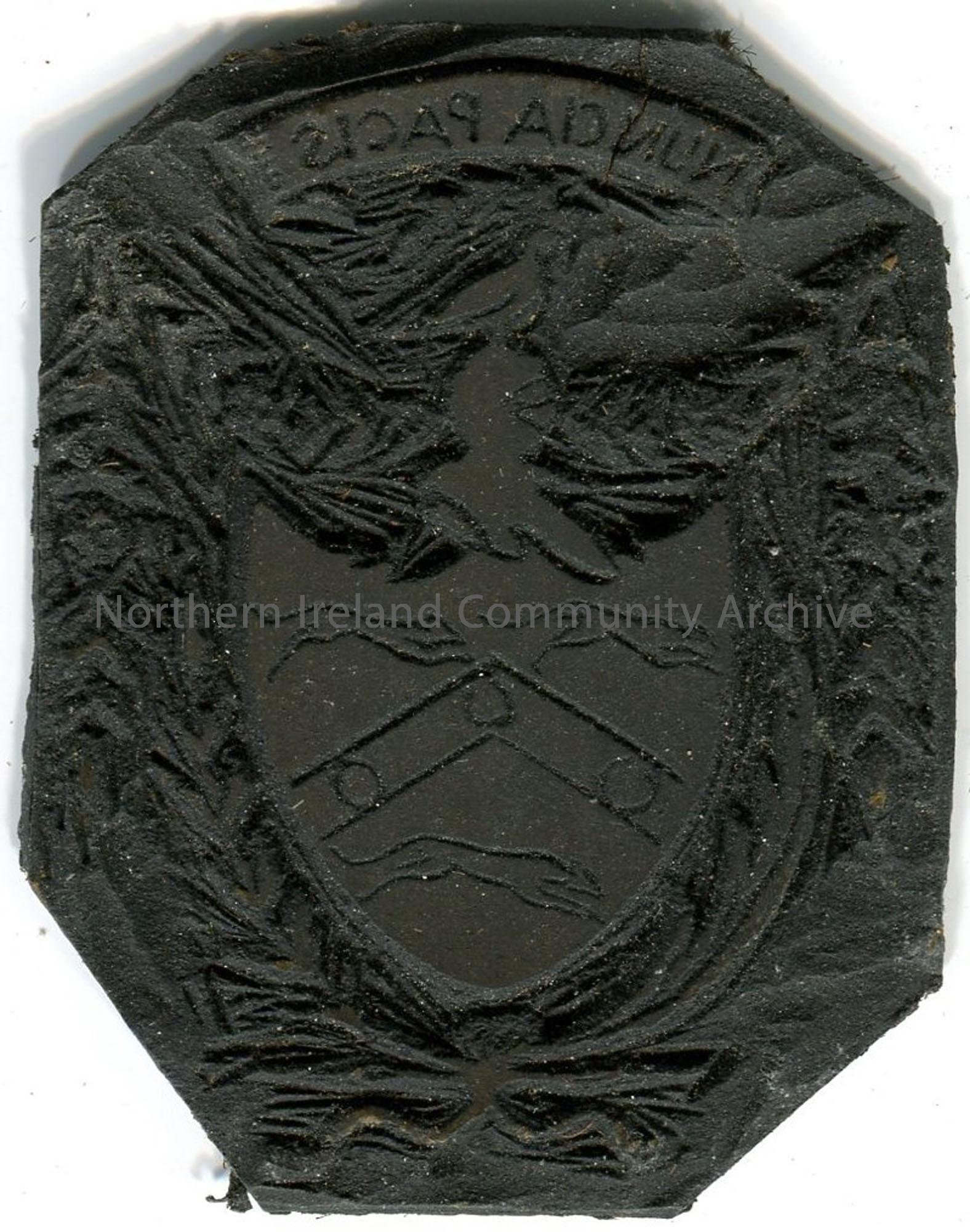 Octagon shaped linocut with red/brown colour backing. Reverse image of a crest - the Church family Coat of Arms. Family motto 'nuncia pacis' [messenger of peace] above crest.