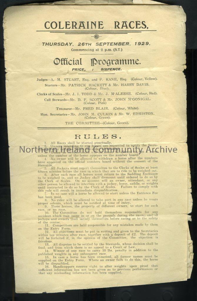 Official Programme for Coleraine Races, Thursday 26th September, 1929. Commencing at 2pm. Details the Rules, the line up, distances and prizes for the First, Second, Third, Fourth, Fifth and Sixth Races. (2933)