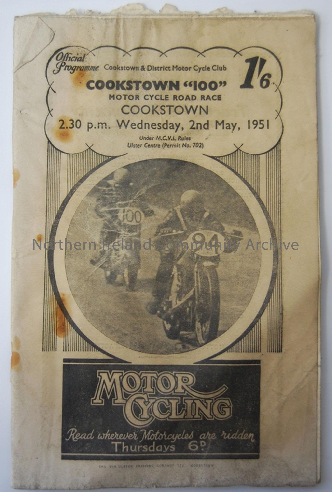 Official Programme of The Cookstown “100” Motorcycle Road Race to be held at Cookstown on Wednesday, 2nd May, 1951.