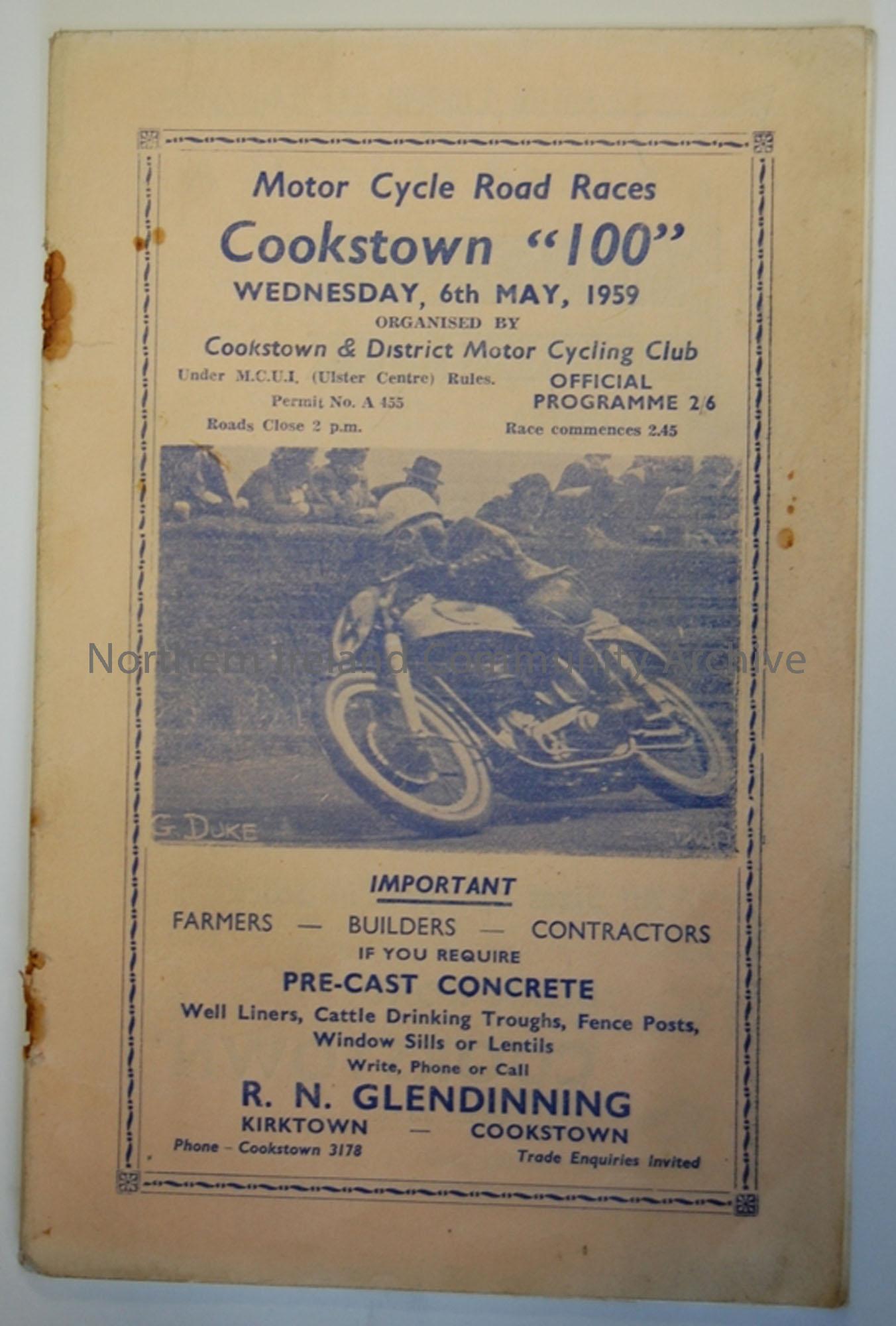 Official Programme of The Cookstown "100" Motorcycle Road Race to be held at Cookstown on Wednesday, 6th May, 1959.