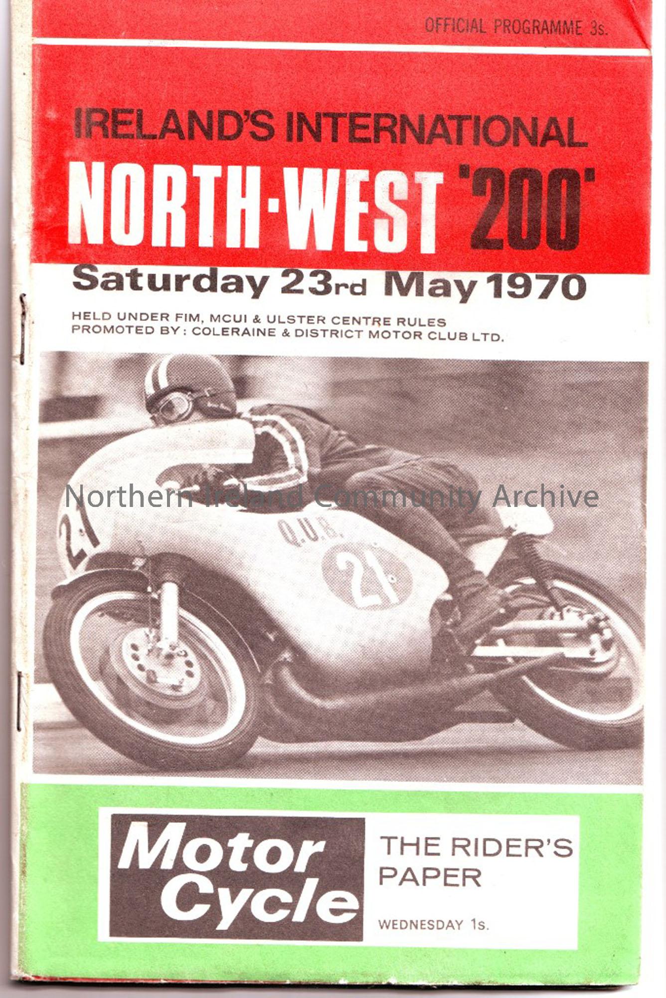 Official Programme of the North West 200, 1970. Includes lists of Entrants in each class and lap score charts. Promoted by Coleraine and District Moto…