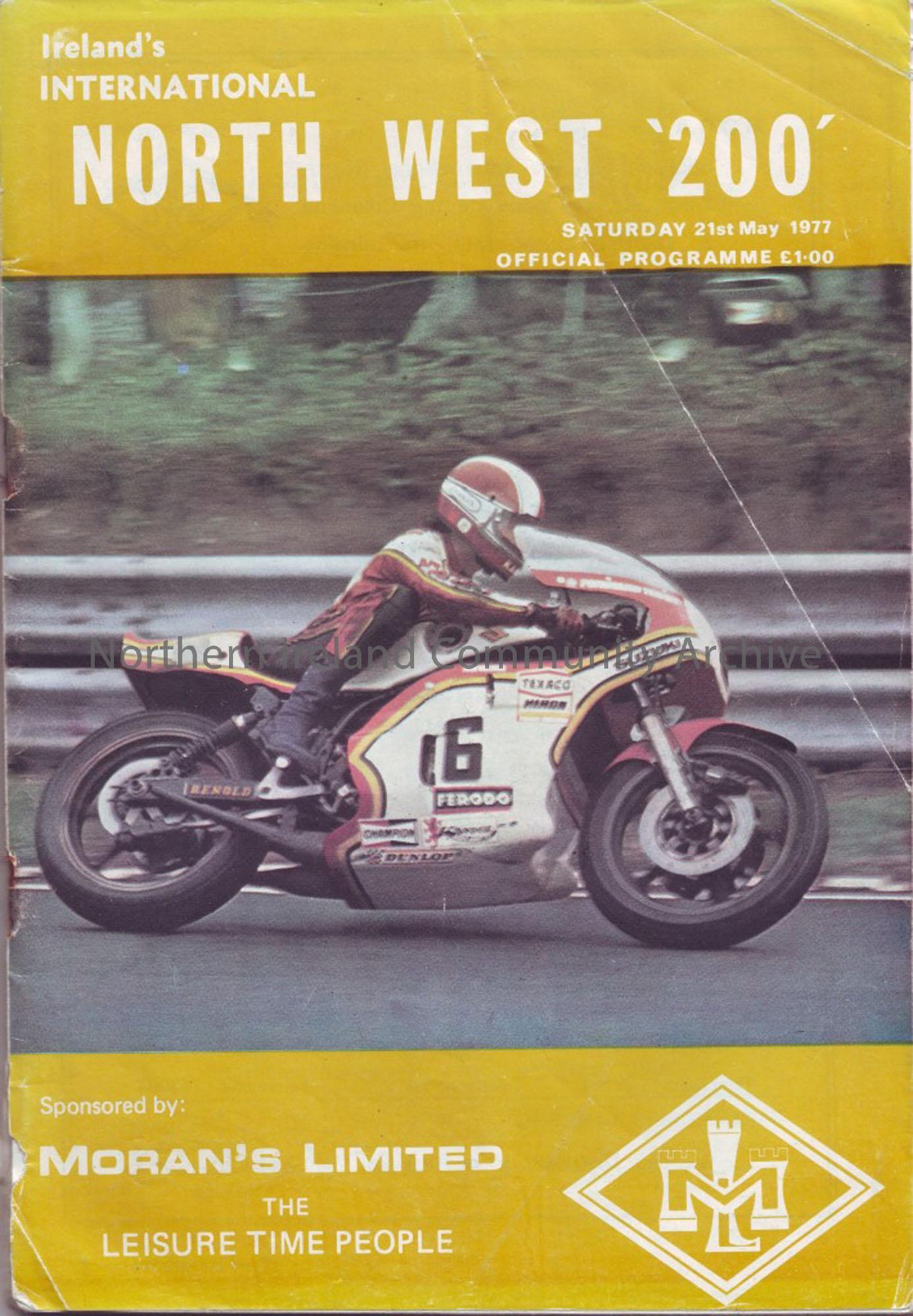Official Programme of the North West 200, 1977. Includes lists of Entrants in each class and lap score charts. Sponsored by Moran’s Limited