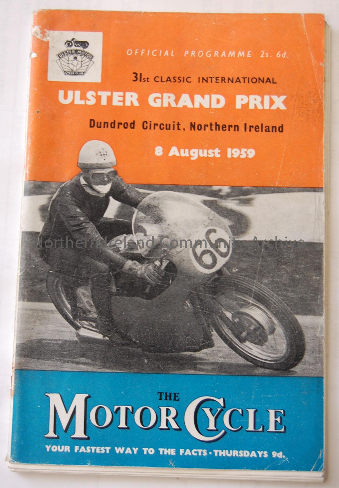 Official Souvenir programme- 31st Classic International Ulster Grand Prix 8th August 1959 Dundrod Circuit, Belfast. Price 2s.6d.