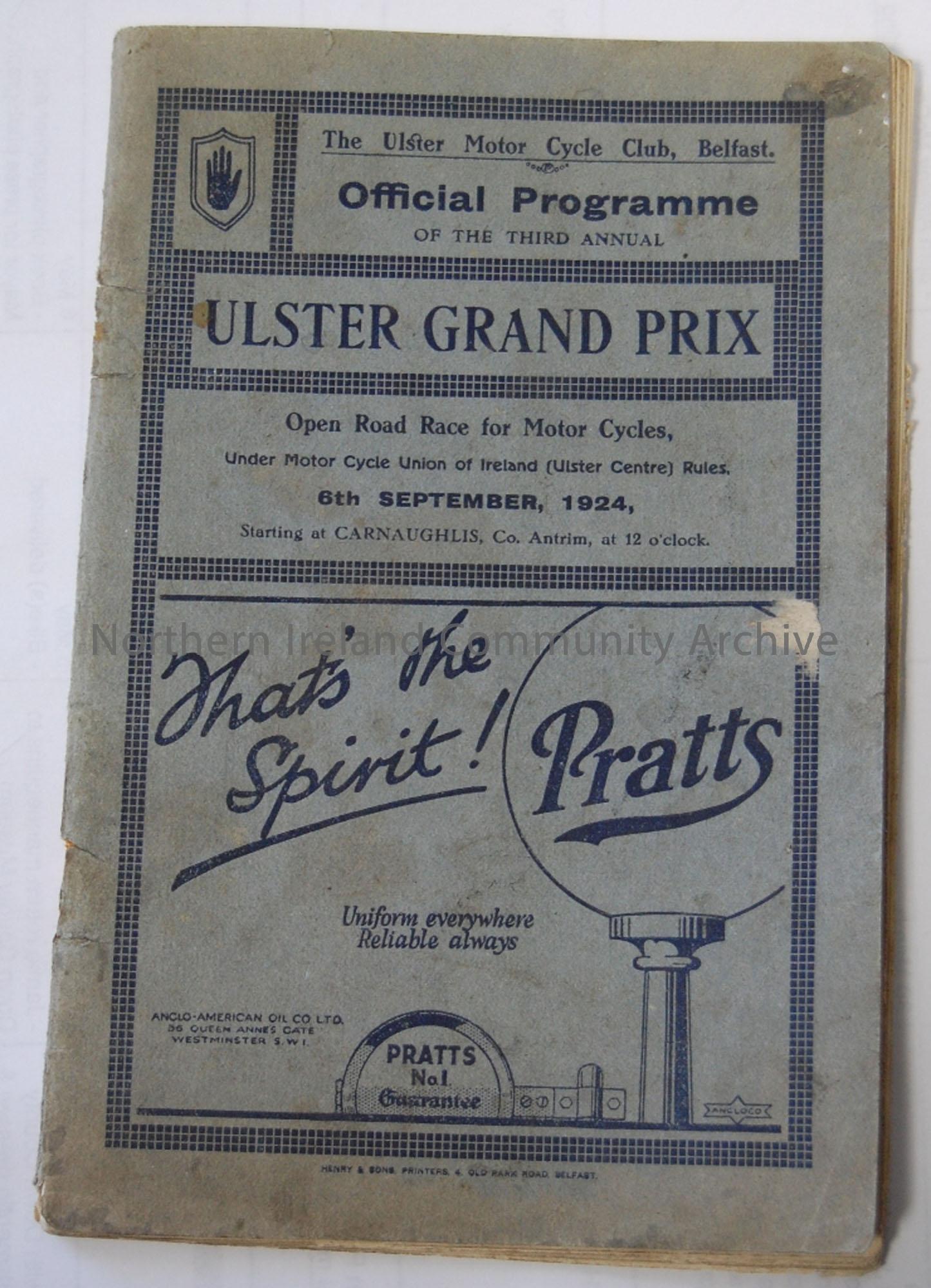 Official Souvenir programme- 3rd Classic International Ulster Grand Prix 6th September, 1924 Price 3d.