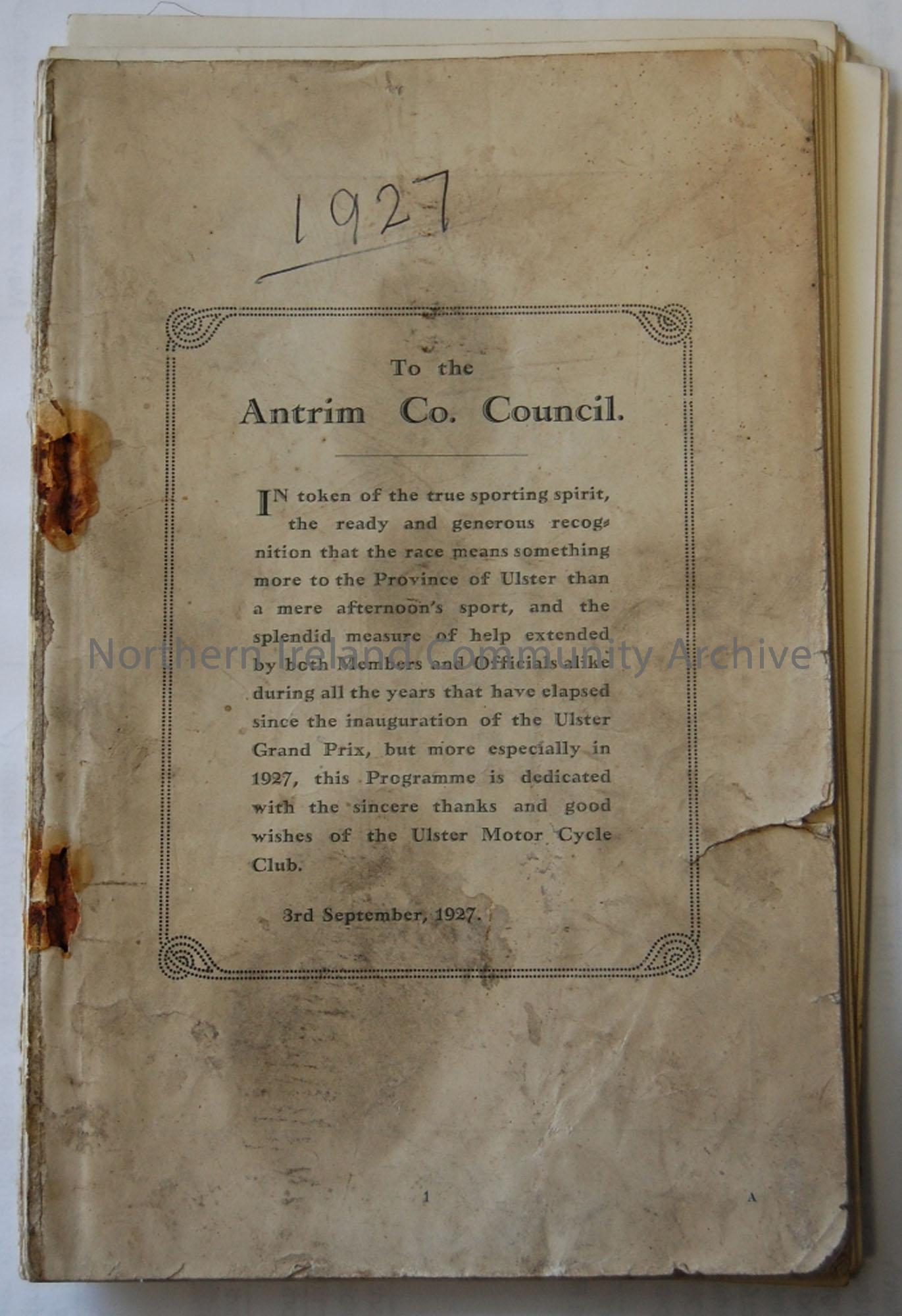 Official Souvenir programme- 3rd September, 1927- To the Antrim Co.Council