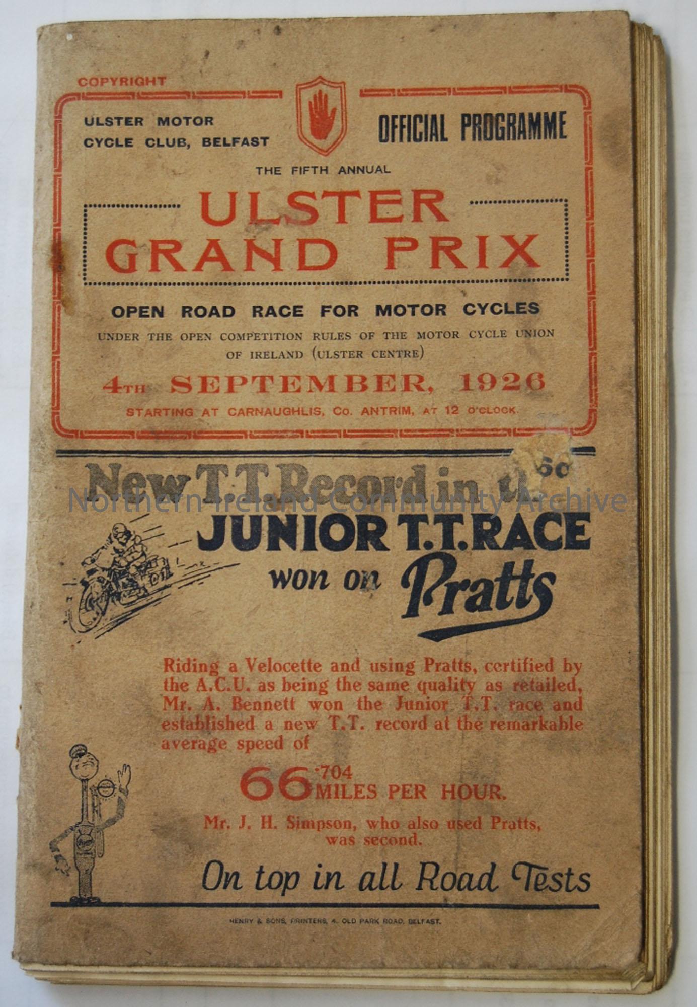 Official Souvenir programme- 5th Ulster Grand Prix 4th September, 1926