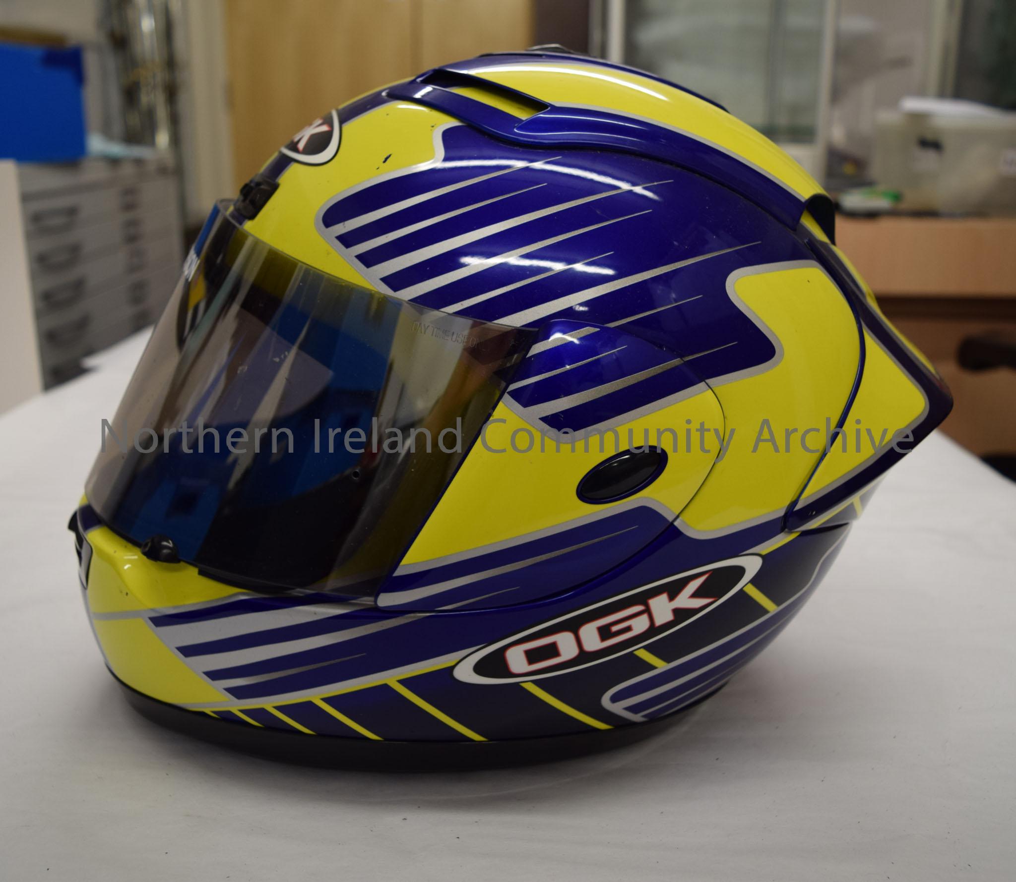OGK motorcycle helmet belonging to Ian Simpson. Yellow helmet with a blue and silver pattern.