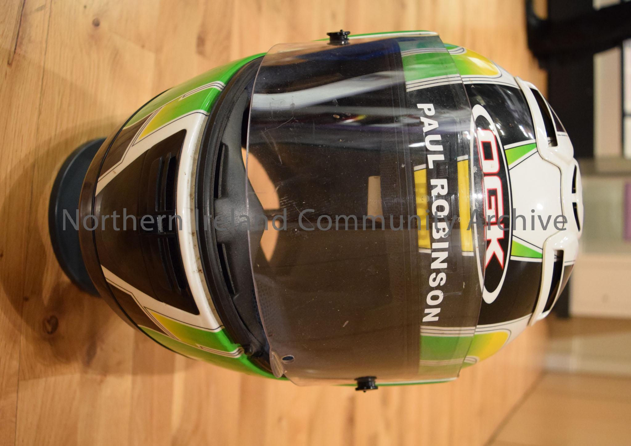 OGK motorcycle helmet belonging to Paul Robinson. White helmet with two “z” shaped black stripes and green and yellow sides. – 2016.116 (2)