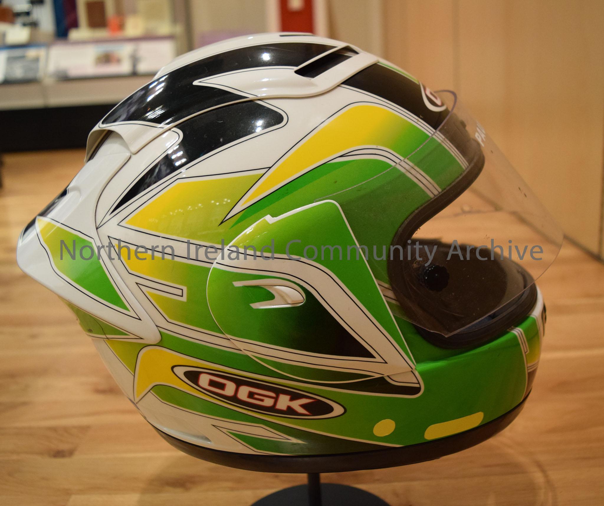 OGK motorcycle helmet belonging to Paul Robinson. White helmet with two “z” shaped black stripes and green and yellow sides. – 2016.116 (5)