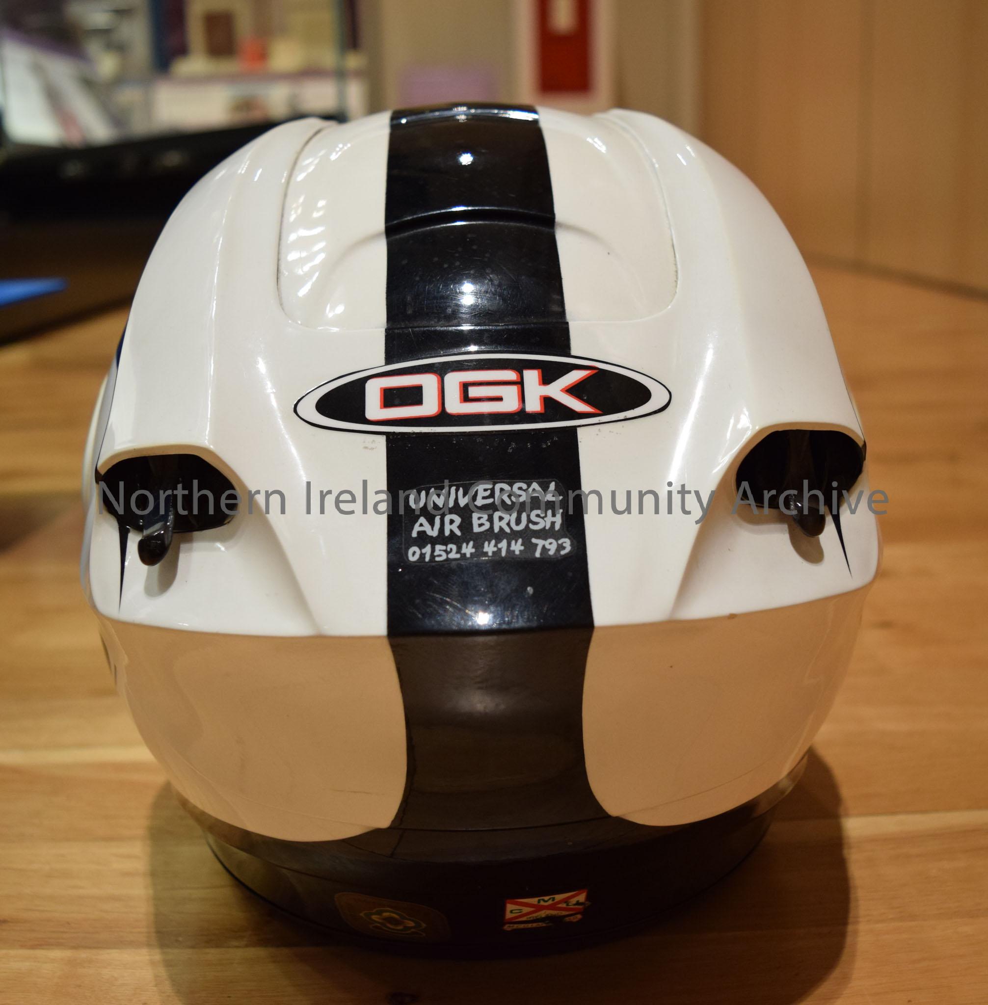 OGK motorcycle helmet belonging to Robert Dunlop. White helmet with a black stripe down the middle and black tear-drop shape on each side. – 2016.111 (4)