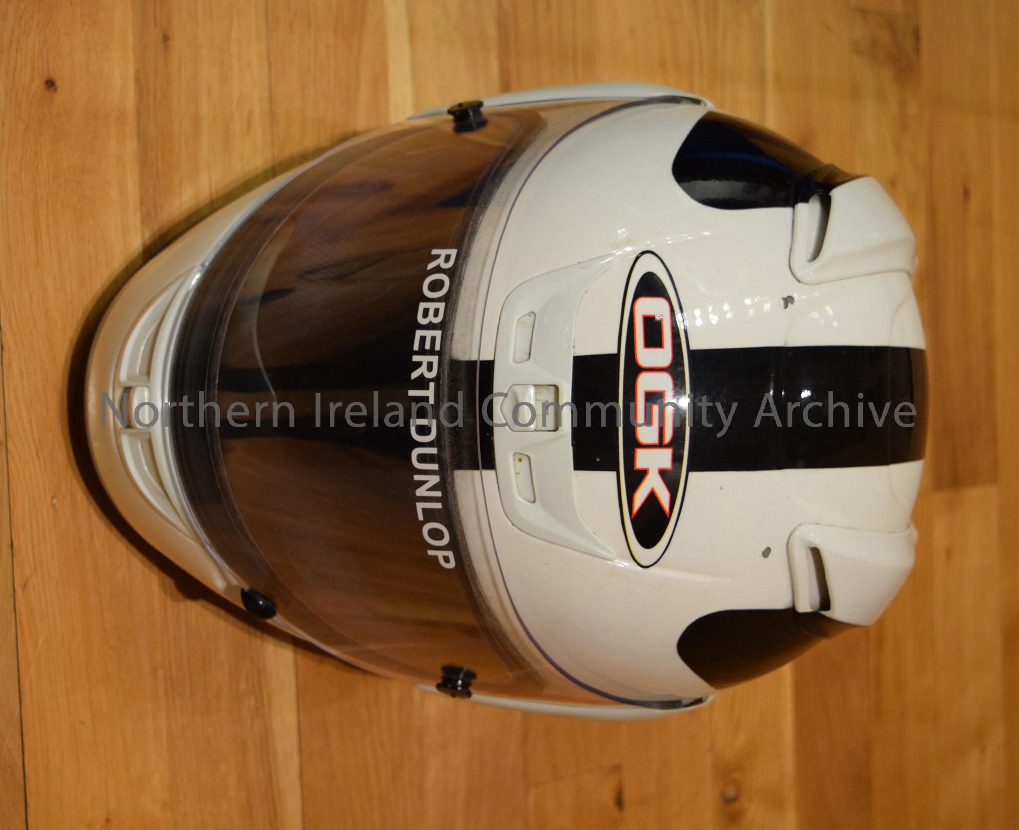 OGK motorcycle helmet belonging to Robert Dunlop. White helmet with a black stripe down the middle and black tear-drop shape on each side.
