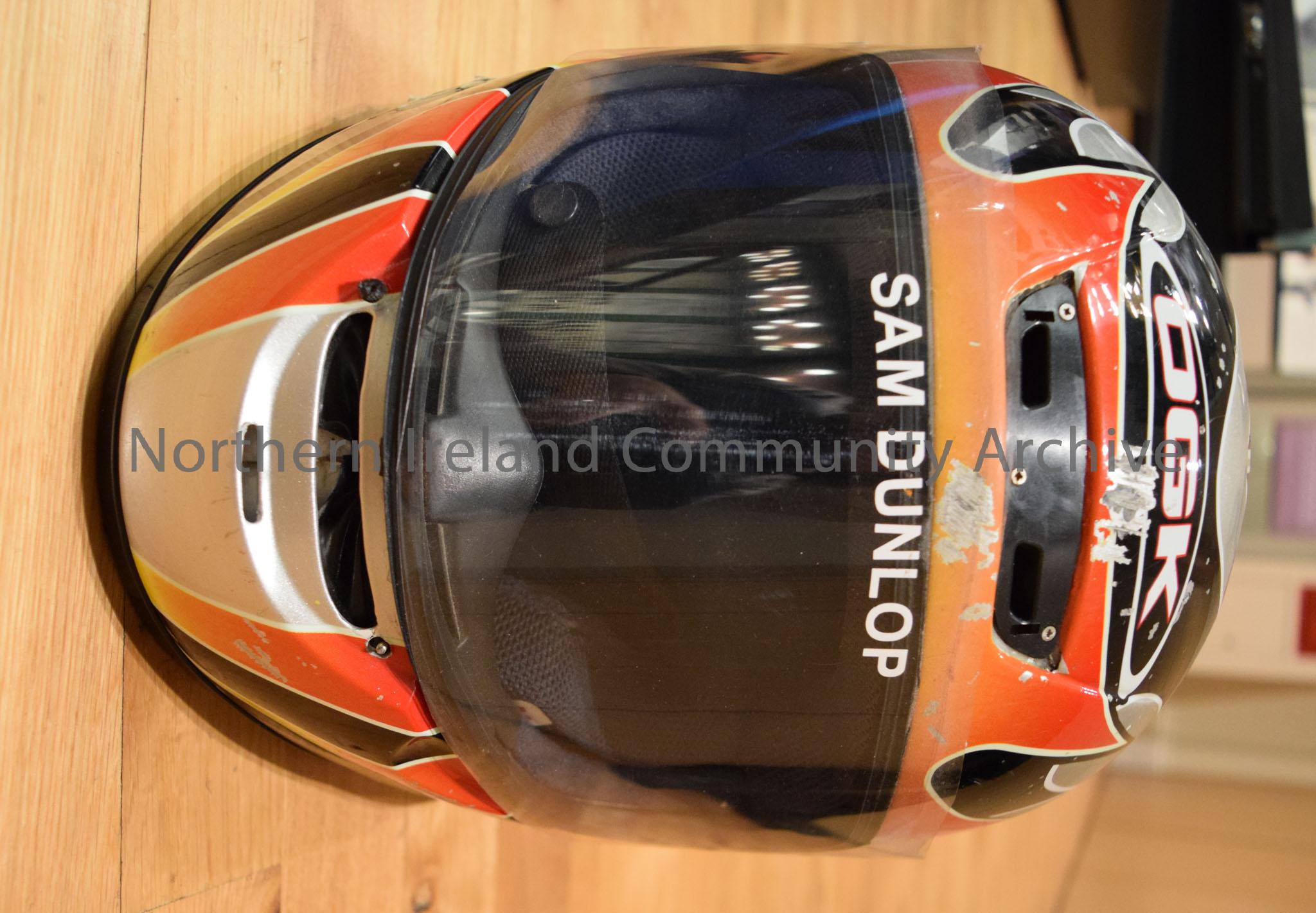 OGK motorcycle helmet belonging to Sam Dunlop. Grey helmet with black stripes and red and orange flame effects on the side and a red and orange curved… – 2016.114 (2)