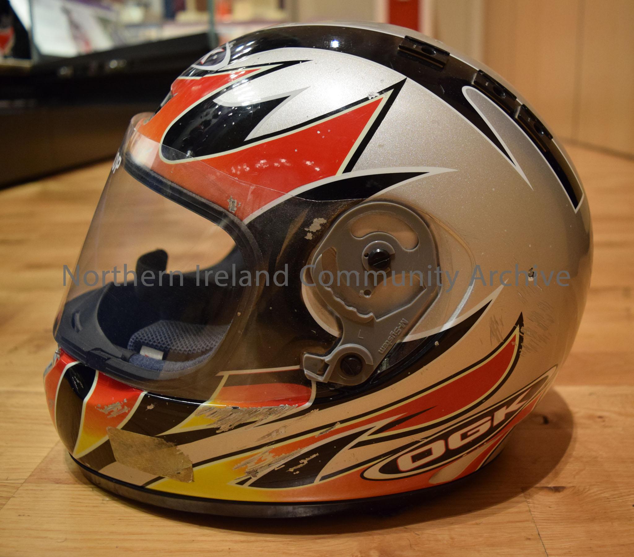 OGK motorcycle helmet belonging to Sam Dunlop. Grey helmet with black stripes and red and orange flame effects on the side and a red and orange curved… – 2016.114 (3)