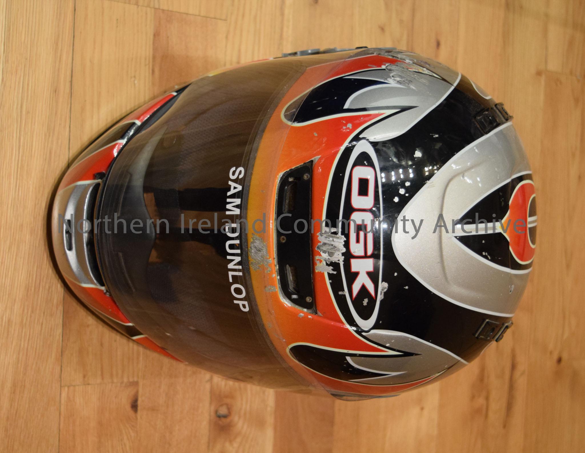 OGK motorcycle helmet belonging to Sam Dunlop. Grey helmet with black stripes and red and orange flame effects on the side and a red and orange curved…
