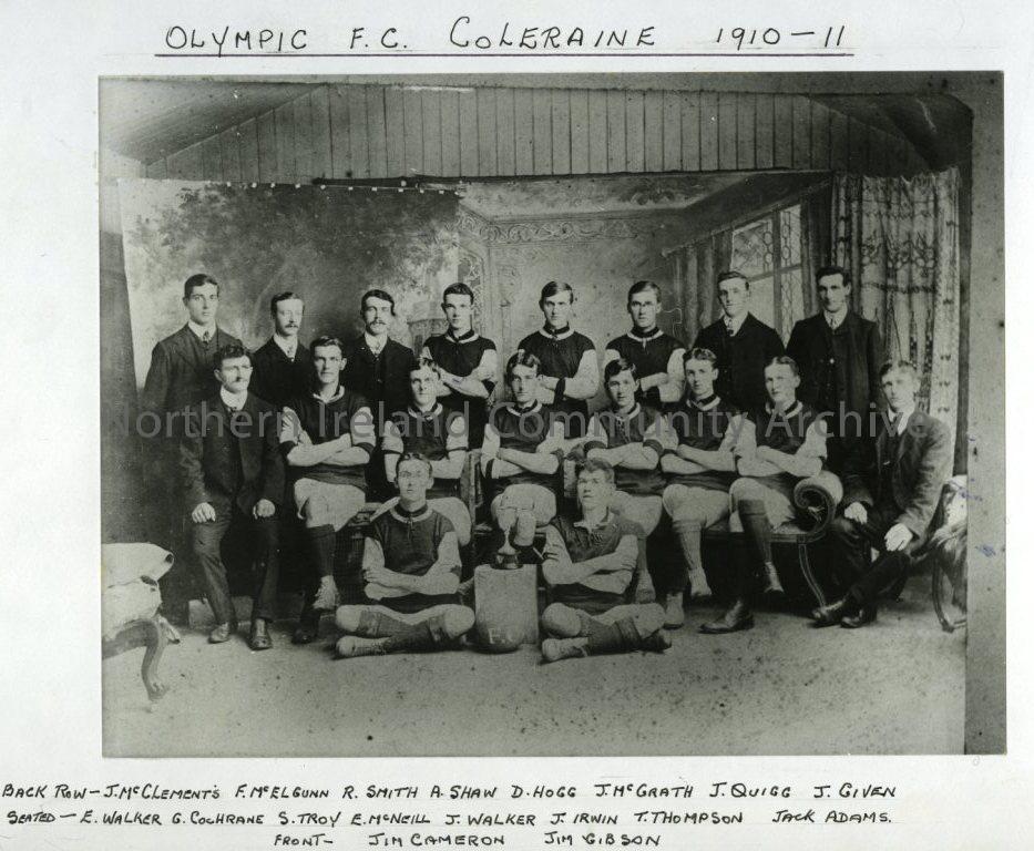 Olympic F.C., Coleraine, 1910-1911: Back Row- J. McClements, F. McElgunn, R. Smith, A. Shaw, D. Hogg, J. McGrath, J. Quigg, J. Given. Seated- E.Walker, G. Cochrane, S. Troy, E. McNeill, J. Walker, J. Irwin, T. Thompson, Jack Adams. Front- Jim and Jim Gi