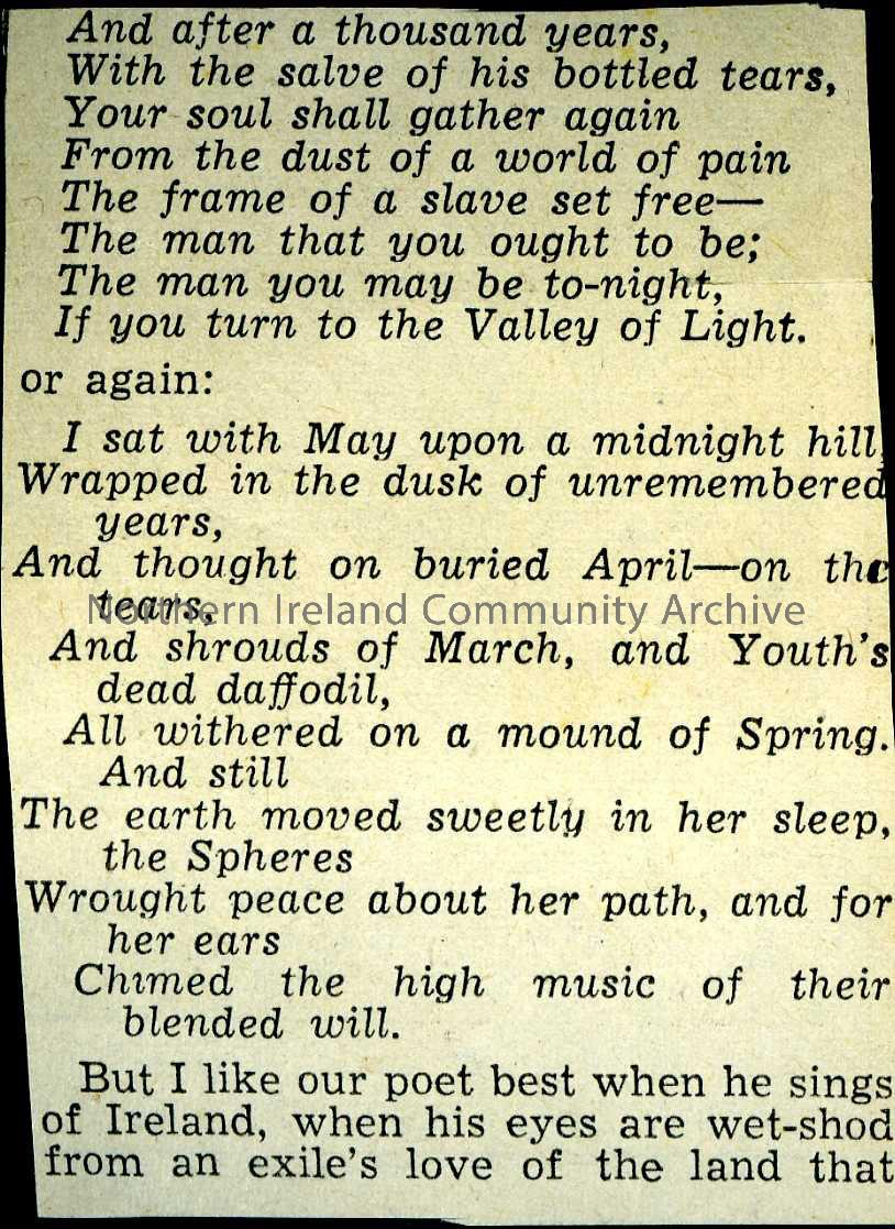 On one side, newspaper article not extracted in full - poems with some notes. Reverse has photo image of a Marcus D Begley - a Marcus D Begley K.C. was appointed Senior Crown Counsel for the Northern Ireland Winter Assizes in 1930