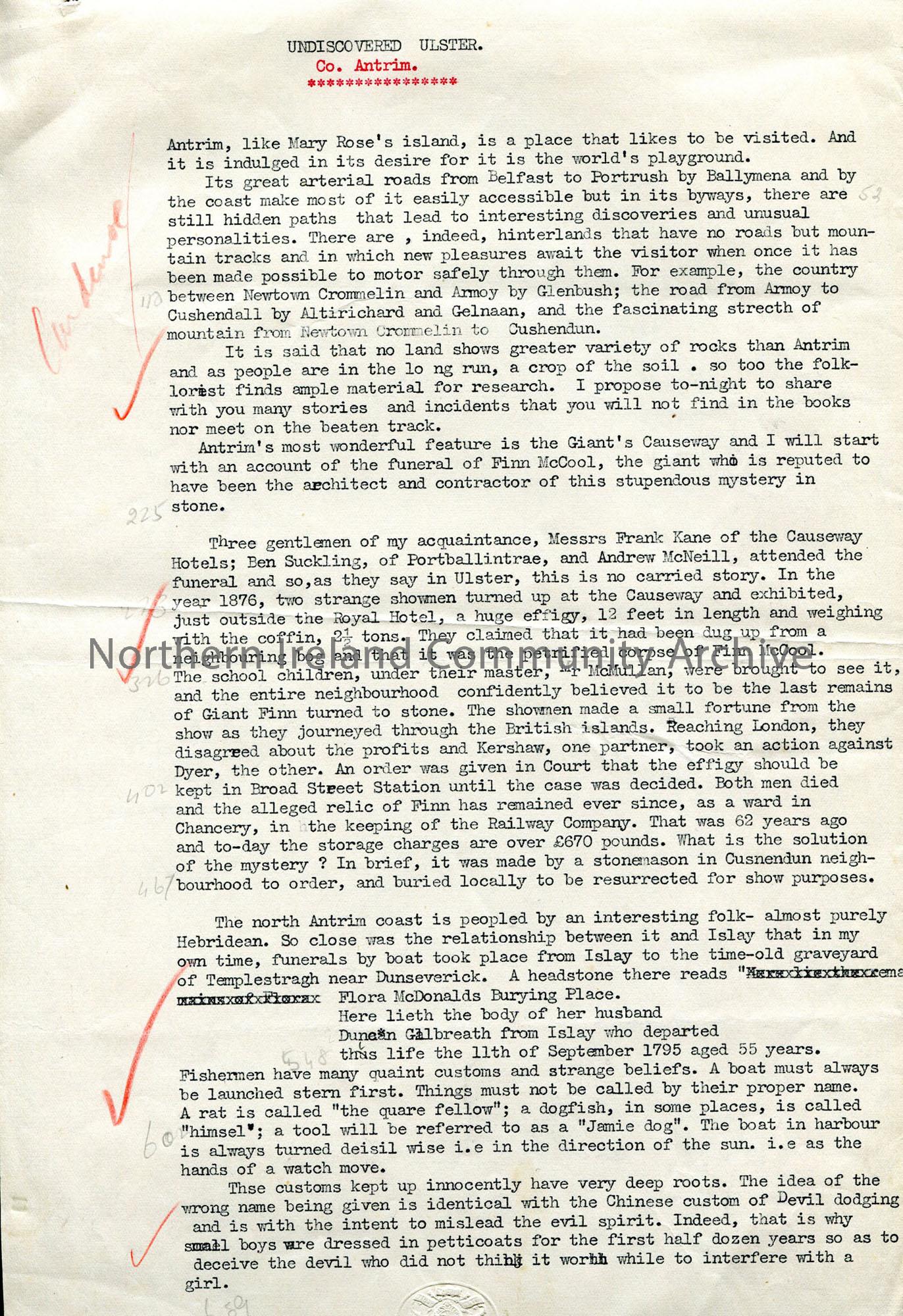 One of 13 pages of typed script, with handwritten corrections, under heading 'Undiscovered Ulster - Co. Antrim'. Some information is repeated - ? mixture of 2 scripts. Uses local dialect. Includes close relationship between North Antrim and Hebrides, with Islay funerals taking place in Dunseverick. Last 3 pages have heading 'Additional notes to be worked in to script'. Descriptive historical trip through various locations in County Antri, with factual and folklore stories and customs.