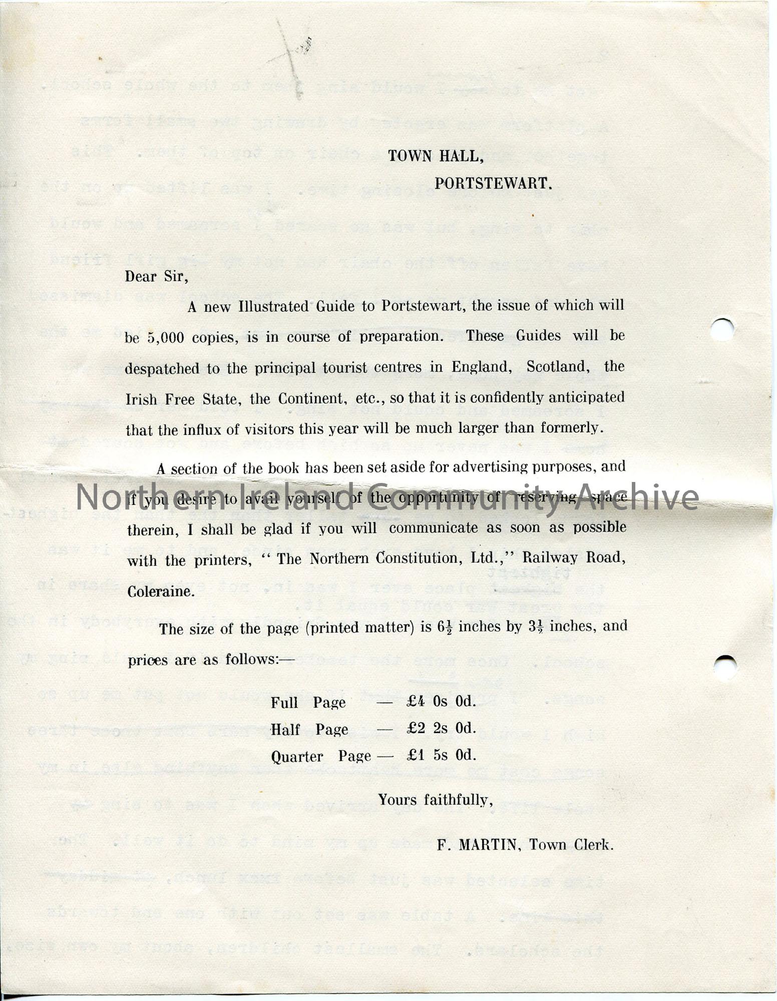 One of 16 pages of typed script. Alex Crawford telling story of school days, fights with school bully, learning songs from his mother. Written on various types of paper - blank pages, back of Northern Constitution headed notepaper, back of Town Hall letter advertising new Portstewart guide