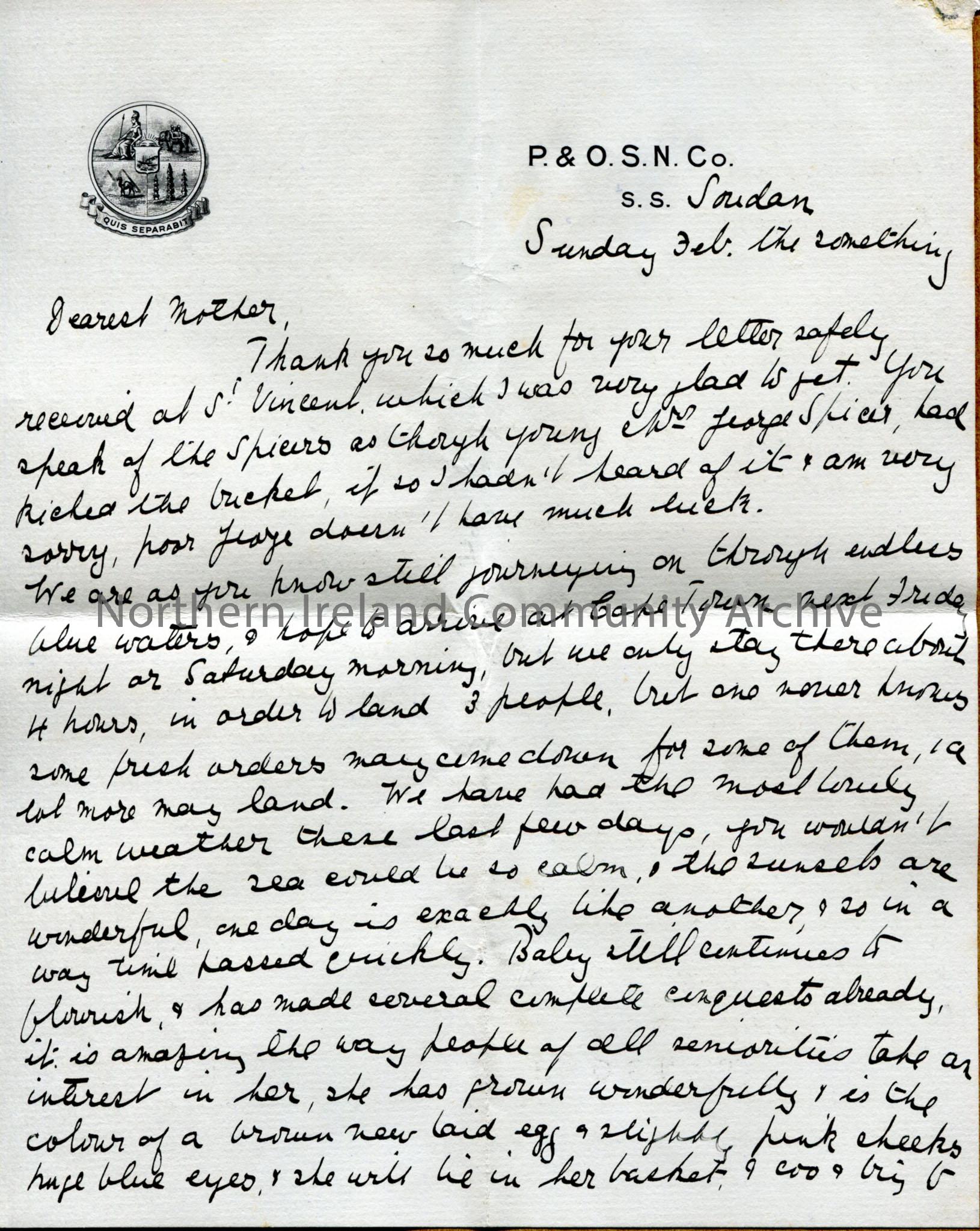 One of 2 and a half pages of letter from Dorothy to her mother, on P&O headed notepaper, from aboard the SS Soudan. En route to South Africa, heading for short stop at Capetown. Talks of: 'baby': life on ship; 'tiny black babies' that she has never seen before and their mothers' interest in Irene; the coal strike at home; difficulty of dressing for dinner with 6 weeks of not being able to wash clothes; ship gossip as told her by nurse.