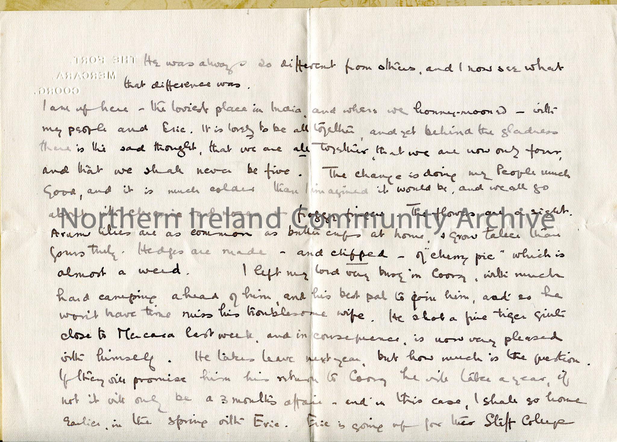One of 2 double pages of handwritten letter, covering all sides. Writes from India, talks of: thanks for sympathy; staying with her 'people and Eric'; husband back in Coorg, hunting tigers; and mentions recipient is in Portrush