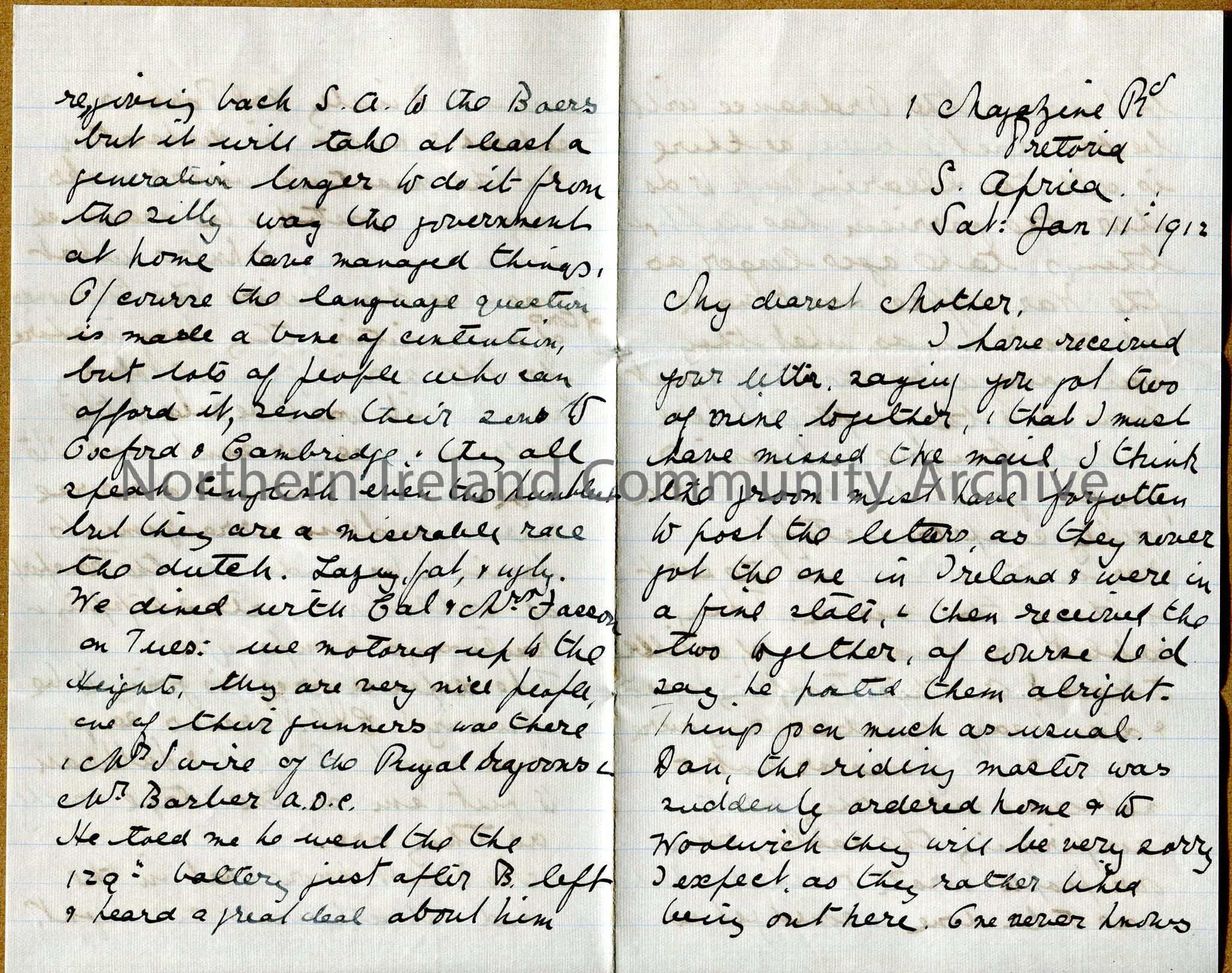 One of 2 double pages of handwritten letter from Dorothy to her mother. Discusses problems with garrison and ammunition transfer/storage, entertainment, South Africa and the Boers - 'a miserable race the Dutch. Lazy, fat and ugly'