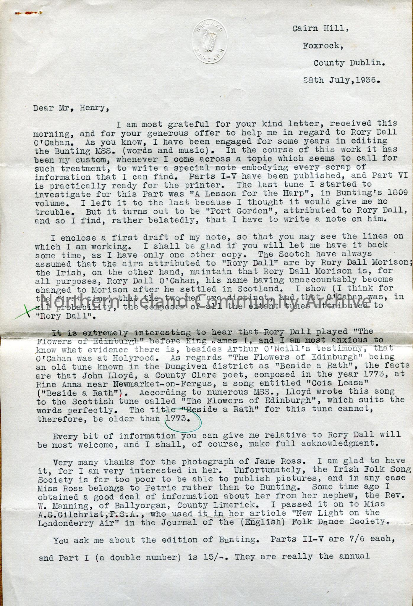 One of 2 pages of a letter to Sam Henry from Donal O'Sullivan, editor of the Bunting MSS, on Seanad Eireann [upper house of Irish Parliament] imprinted paper. Re Rory Dall O'Cahan [also ? known as Morison - depending on View in Ireland, where he came from, or Scotland, where he settled] and biographical background.