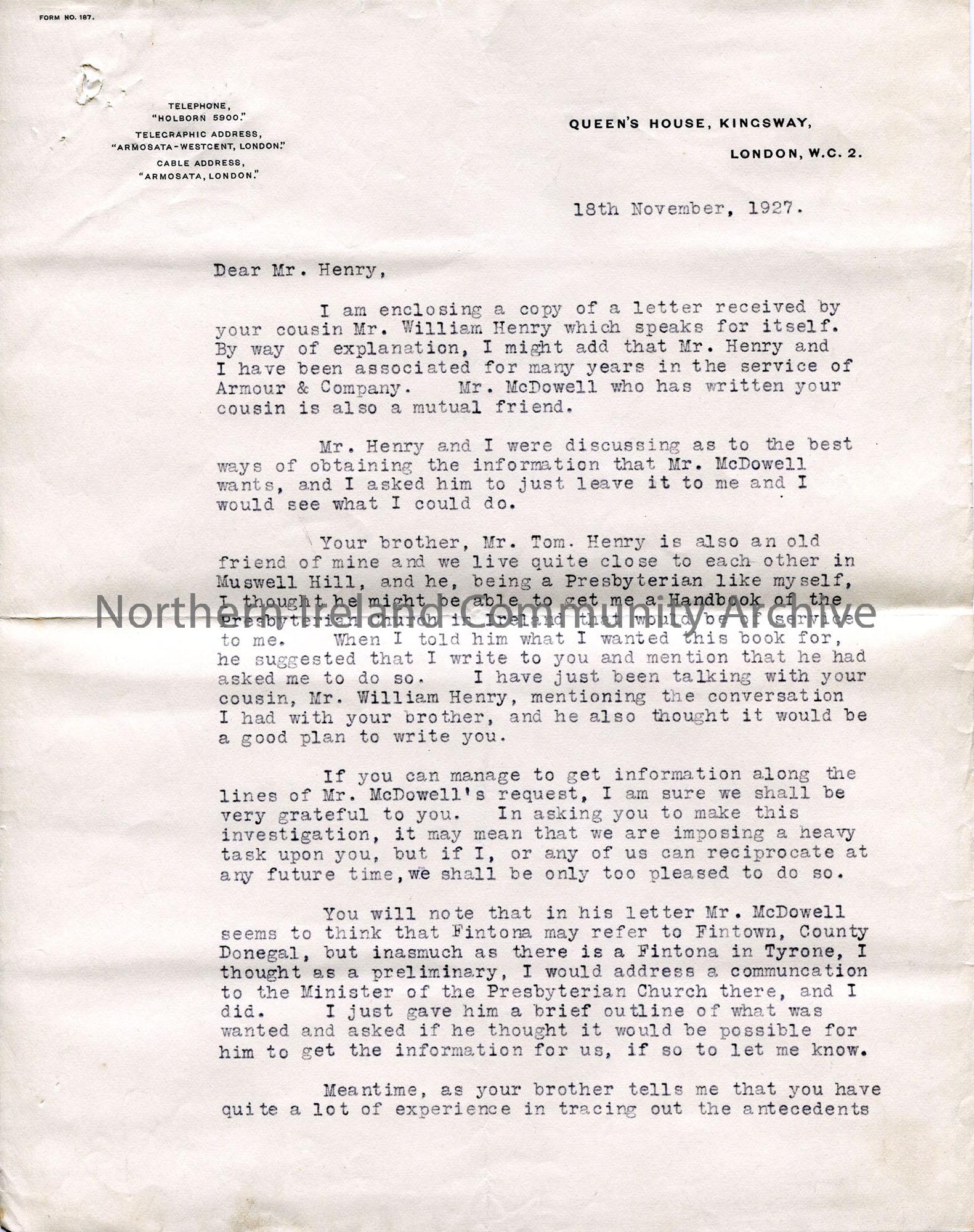 One of 2 pages of a typed letter on headed notepaper. Introductory letter from Gillies on behalf of Mr McDowell, asking for help in tracing Irish ancestry, especially around Fintona