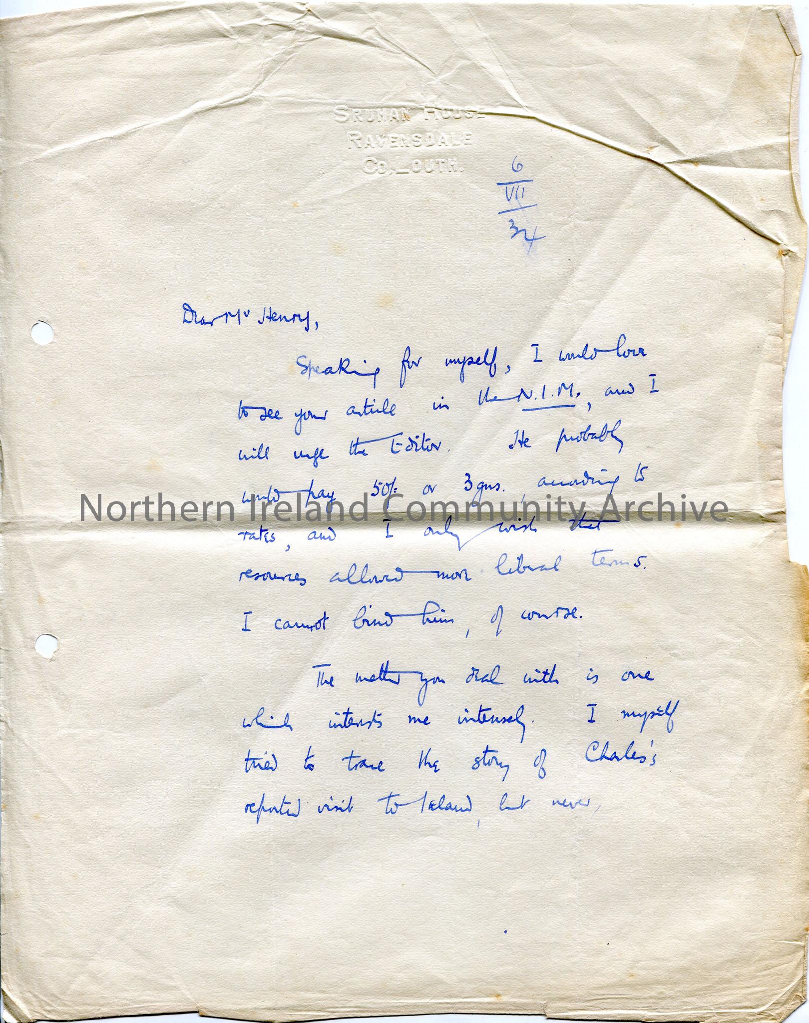 One of 2 pages of handwritten letter. Author supports publication of Sam's article on Prince Charlie's reported stay in Donegal - had tried the story himself but could never find solid information