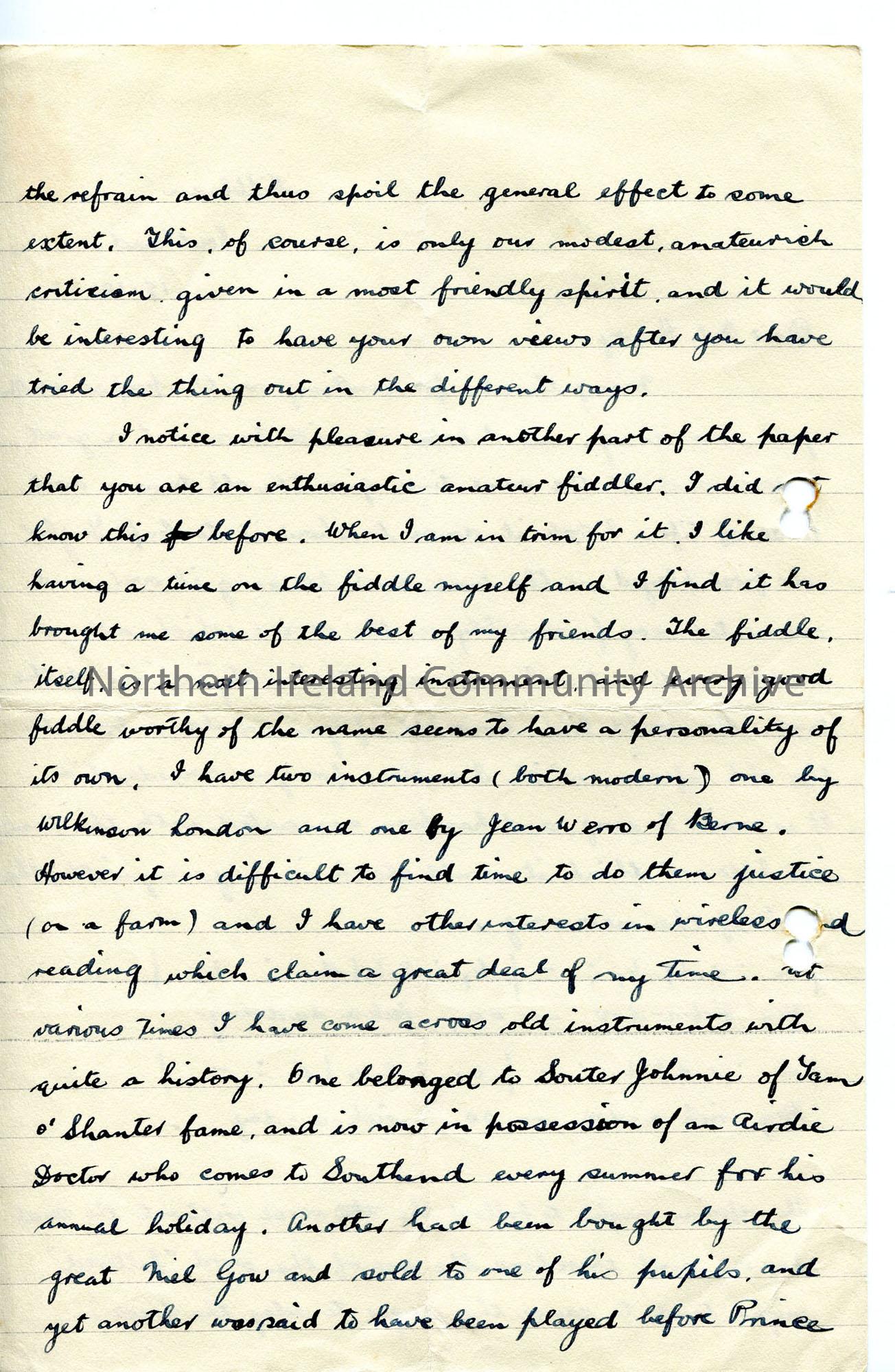 One of 2 pages of handwritten letter. Comments on Sam’s words for old tune (‘The Braxy Skin’) – has been sung by friend and they think he should use o… – img481