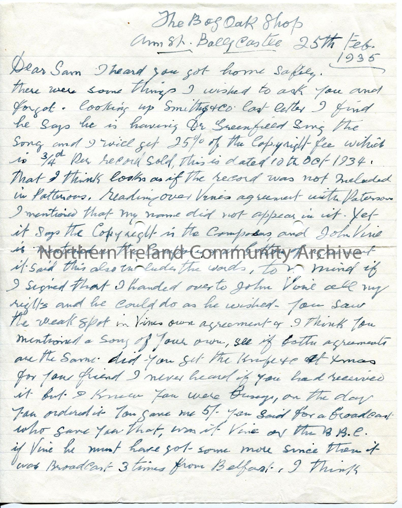 One of 2 pages of handwritten letter - discussion of copyright issues over his words to song, 'Vine' being given same and can do as he wishes - mentions Vine's agreement with Patersons . Possibility of Hayward and Vine doing same to Sam, over songs in Constitution. Also talks of his ill health.