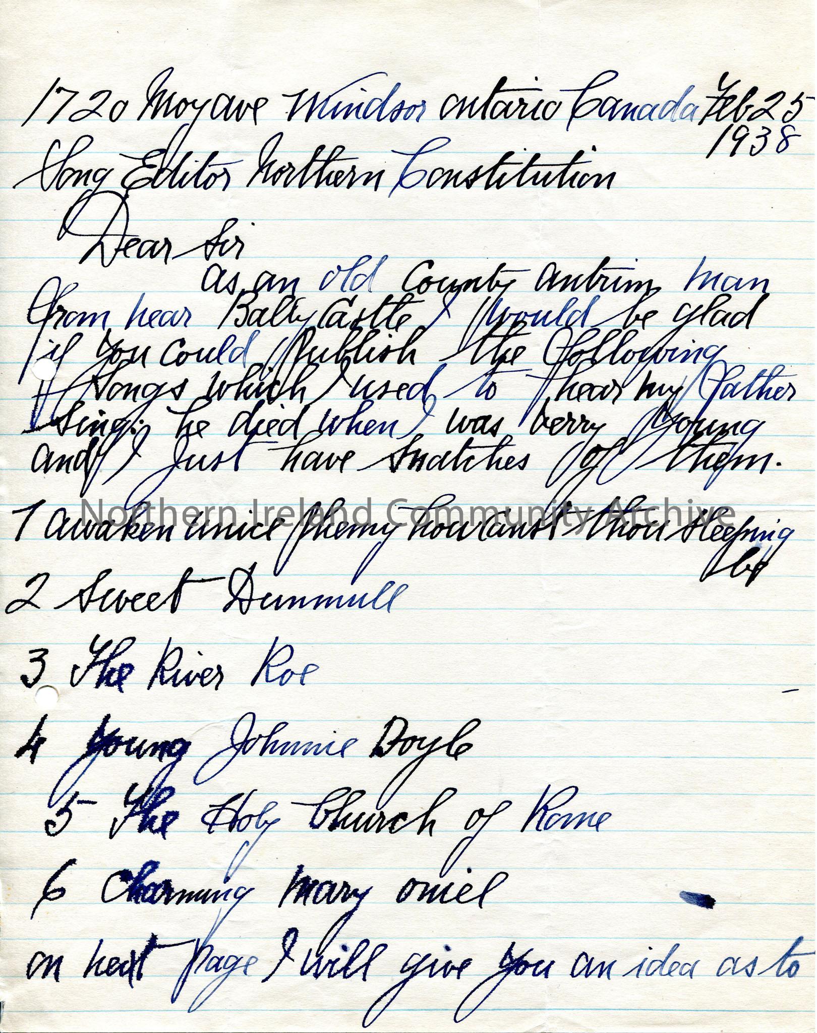 One of 2 pages of handwritten letter from former Ballycastle resident now living in Ontario, Canada, re song information. Gives titles of songs and so…