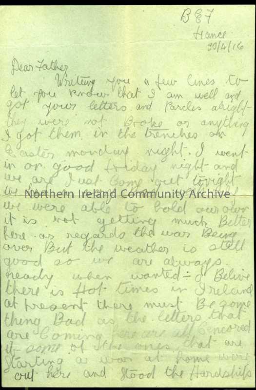 One of 2 pages of handwritten letter from James to his father. Went into trenches on Good Friday and and just out - "a very bad week". Mentions "hot times in Ireland" - all letters being delivered have been censored. War is bad but if gets home "God Pity them fenian Rascals". All leave stopped for Irish troops. Worried not knowing exactly what is happening at home and effect on brothers William and especially Sandy.