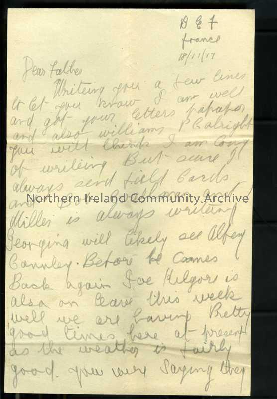 One of 2 pages of handwritten letter from James to his father.Mentions Georgina, Sandy and William [brothers] and hiring fair and employment. Also mentions Sammie Millar, Bob Creelman, Tommie Turner, Joe Kilgore, Alfey Connley [?Connolly].