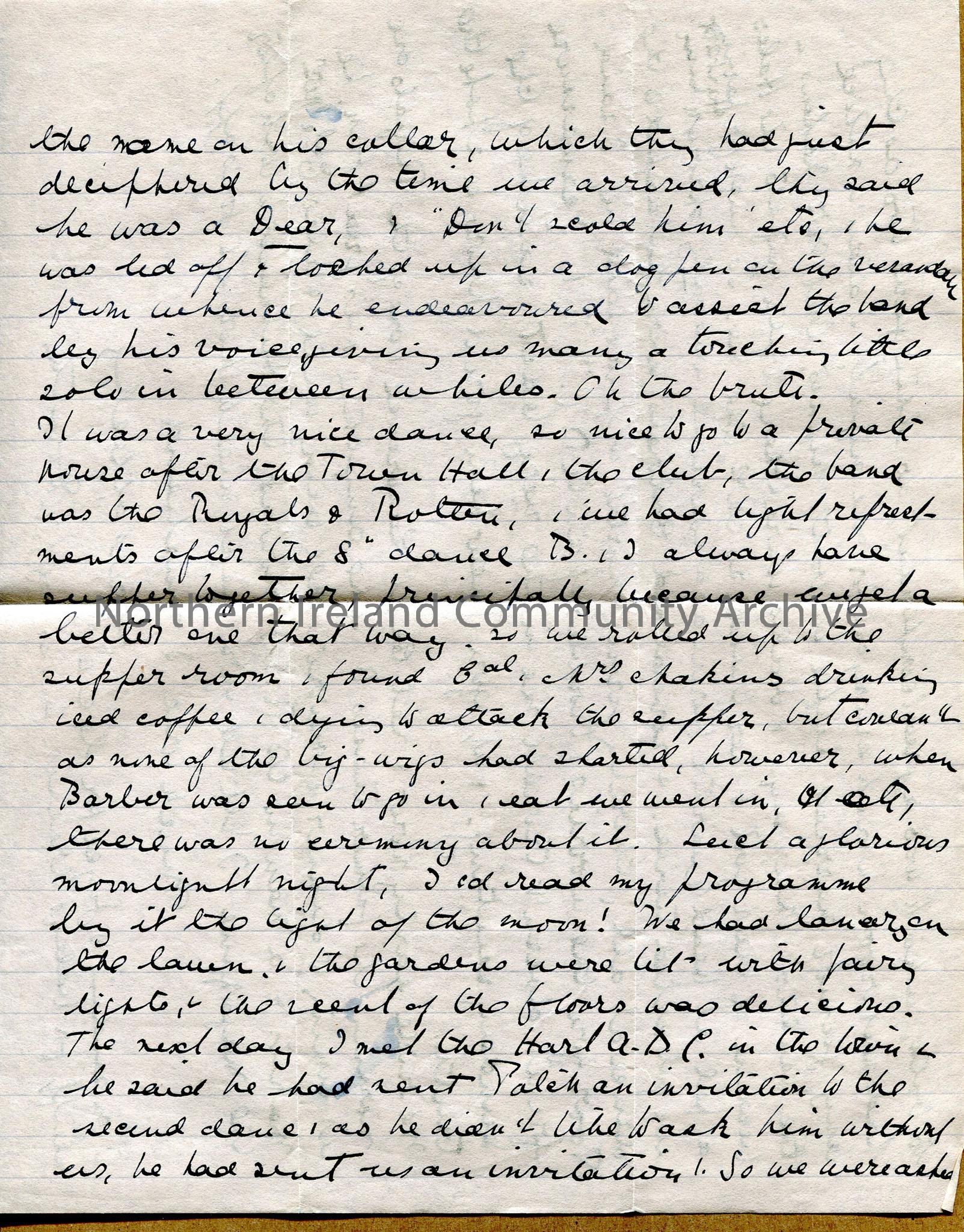 One of 2 pages of handwritten letter. Handwriting direction differs back and front. Story of attending dance (wore her wedding dress) - locked dog up but escaped, followed them and entered dance floor hours later. Mentions wanting lace for baby dresses.
