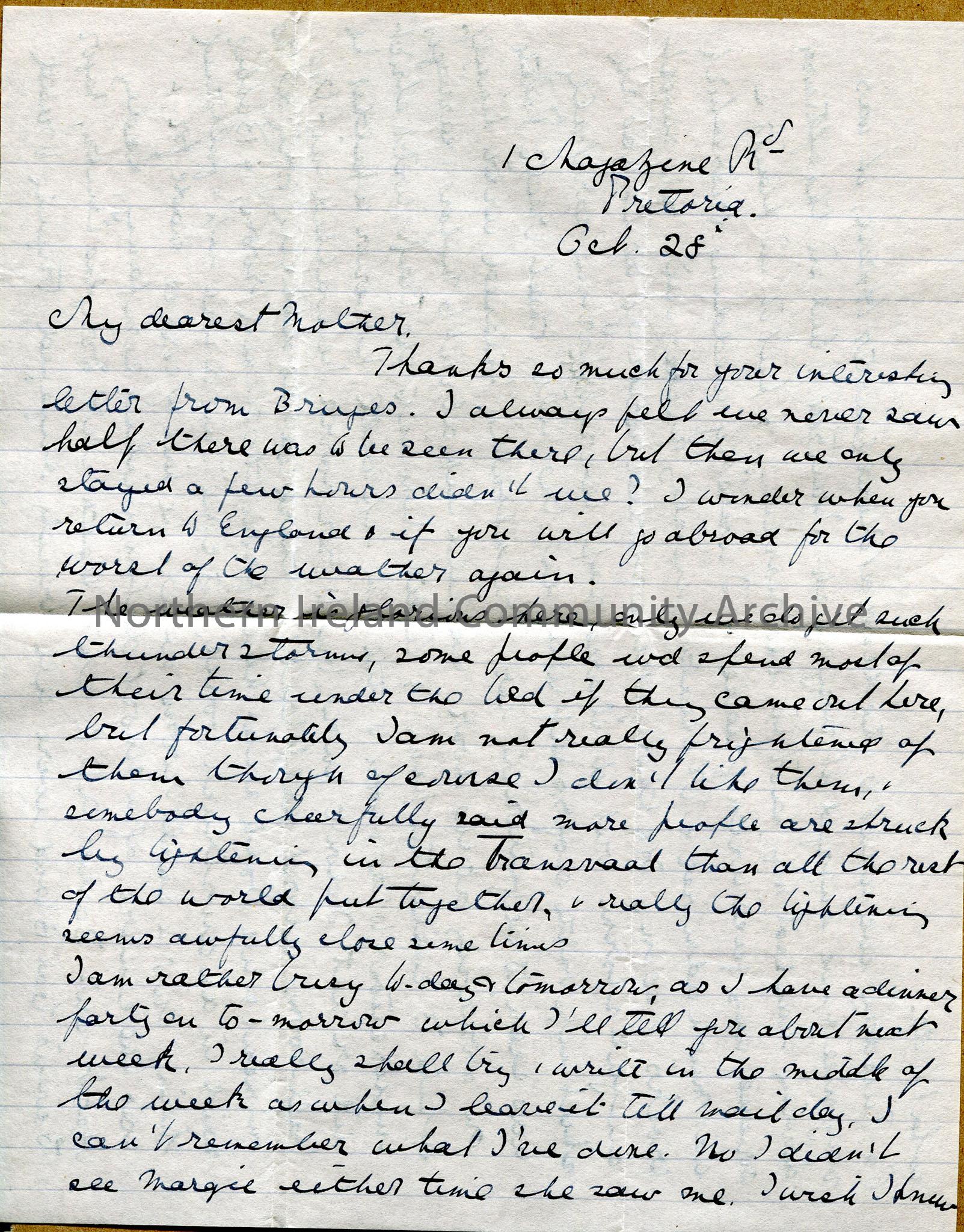 One of 2 pages of handwritten letter. Handwriting direction differs back and front. Story of attending dance (wore her wedding dress) - locked dog up but escaped, followed them and entered dance floor hours later. Mentions wanting lace for baby dresses.