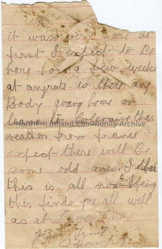 One of 2 pages of handwritten letter in pencil from James to his father. At base – right side still sore so not doing anything. Gives address – noted … – 40b