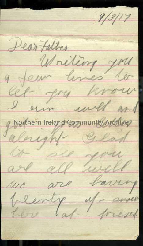 One of 2 pages of handwritten letter in pencil from James to his father. Expects to have leave in week or so. Snowing