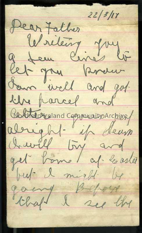 One of 2 pages of handwritten letter in pencil from James to his father. Hopes to get home at Easter. “British are going on well on the western front”