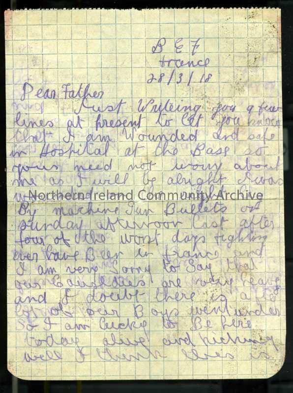 One of 2 pages of handwritten letter in purple pencil from James to his father. In hospital, wounded in leg after "4 of the worst days fighting", heavy casualties.